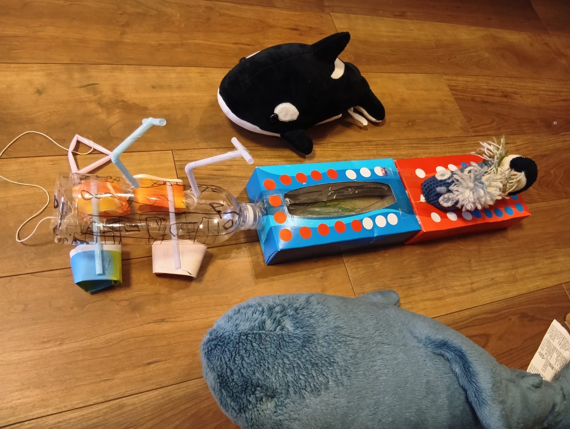 完成後も動かして遊んでいるというのがまた素敵。作品が「つくって終わり」じゃなくて、遊びや想像の世界に続いているのがすばらしいです。