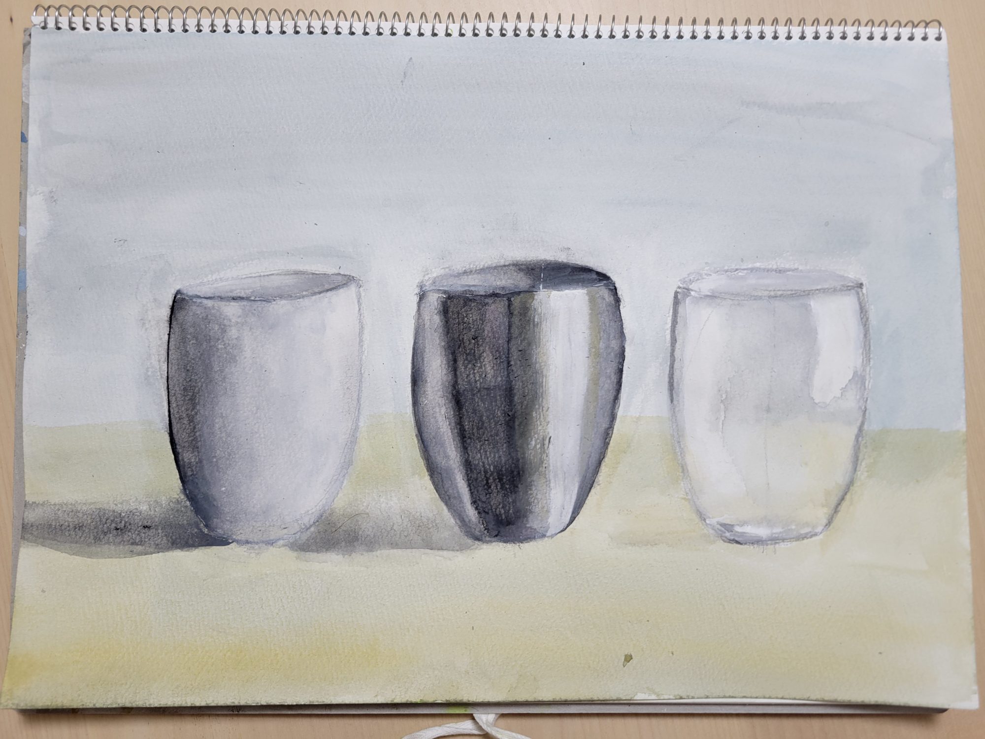 中央の金属のコップは、強いコントラストとくっきりしたハイライトによって、金属特有の冷たさや重さがリアルに伝わってきました✨先生のアドバイスを取り入れて描き方を工夫したのがよくわかります。