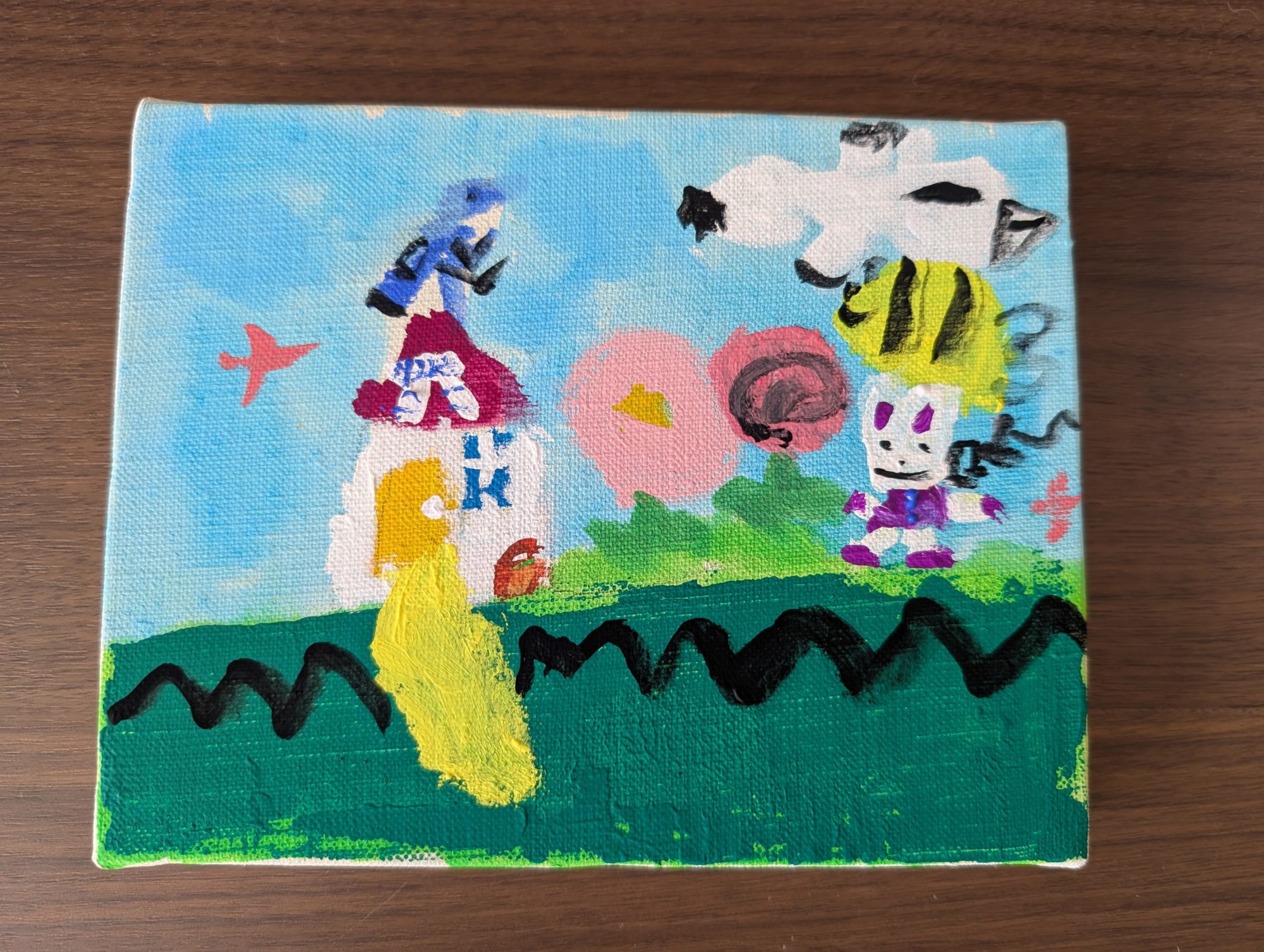 たくみ先生 先生2025年7月30日 9:06 AM 初キャンバスだったのですね!楽しんでいてだけて嬉しいです! リボンのチェック模様が細かい〜!沢山筆を使い分けて細かく描いてますね。 お家も気になるし、うさちゃんの上にいるのは何か、とても気になります。 これから絵の具のおもしろ課題もいっぱいありますので、楽しみにお待ちください〜! ログインして返信する ↓