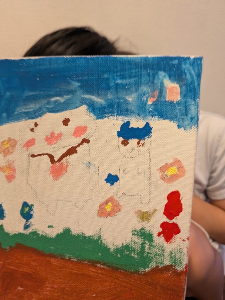 アクリル絵の具の発色がとてもきれいで、背景のグラデーションや花の表現も工夫されていますね🌸