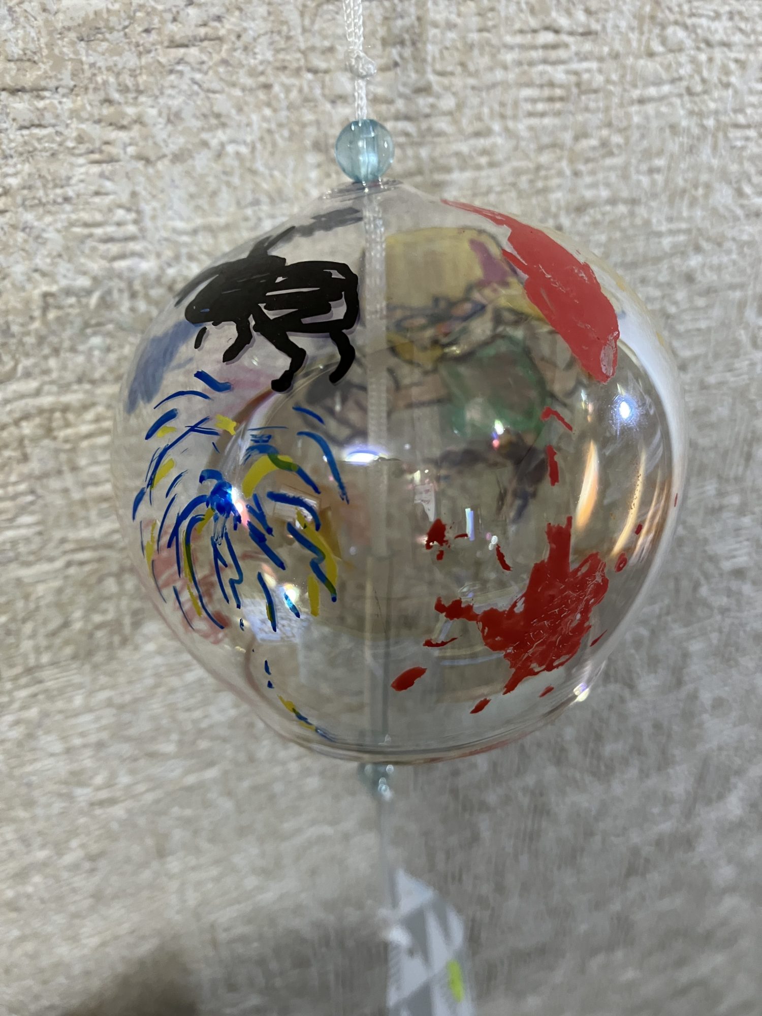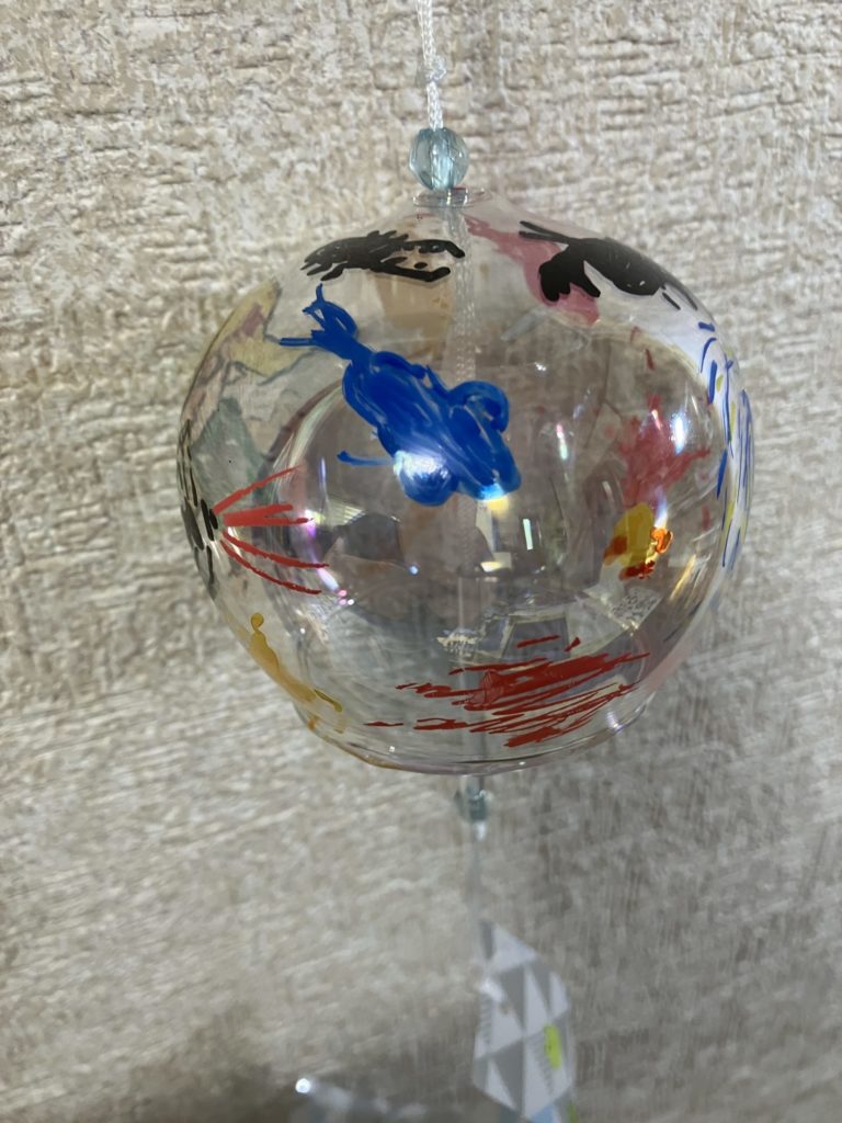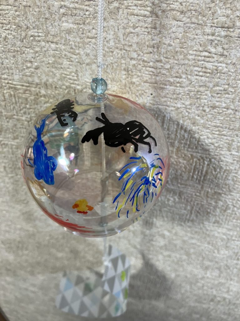 児童館の風鈴制作にて。カラーペンで思いついた絵を描きました。スプラトゥーンのキャラクターがラクト(武器)からインクを出しています。飛び出したインクの形は、金魚やカブトムシ、クワガタ、花火、オリジナルキャラクターのいもくんなど、色々なものを表しています。