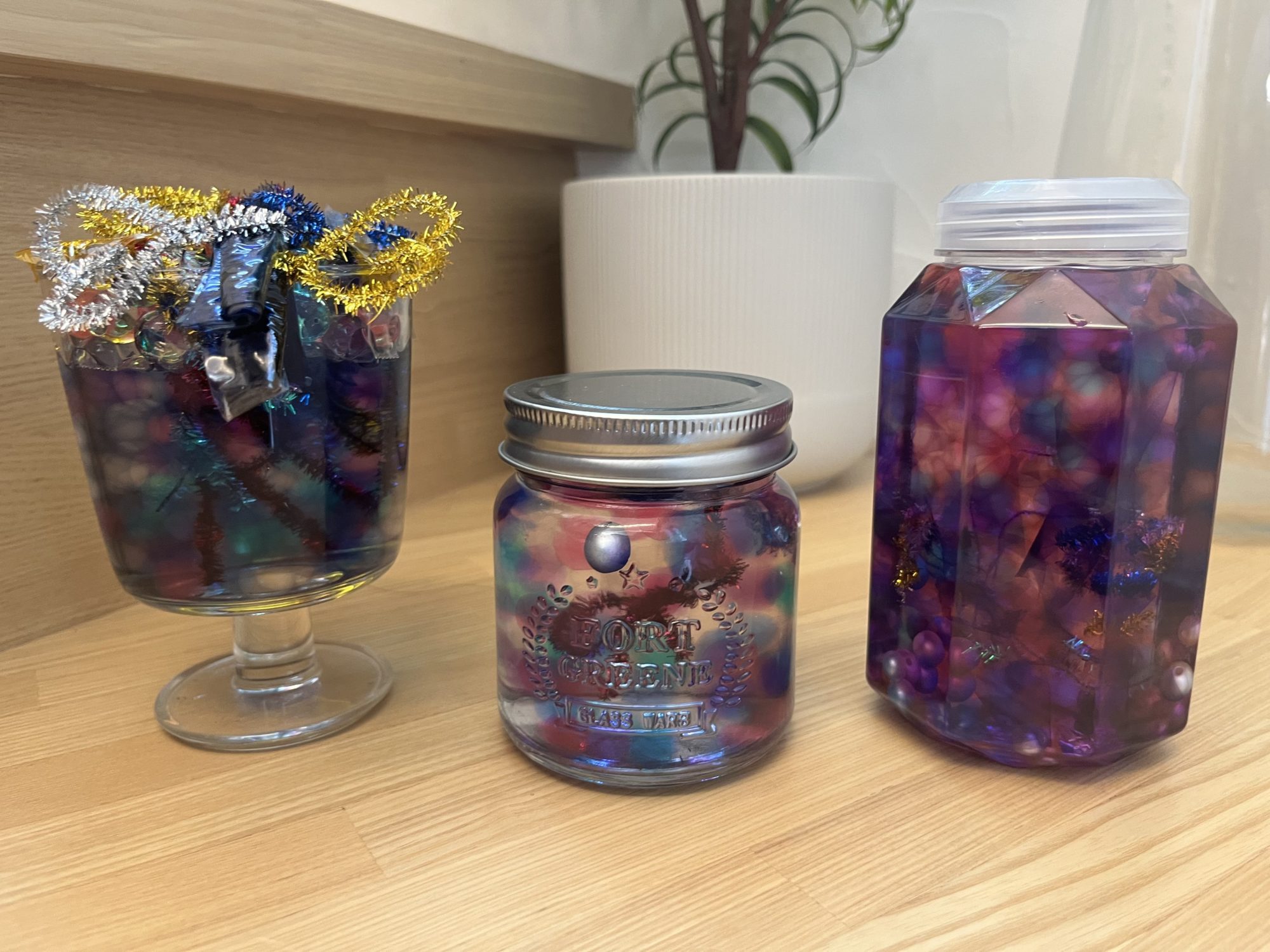 モールを細かく切って散りばめた工夫が、光を受けてキラキラ輝き、まるで小さな宝物が詰まっているようです。
