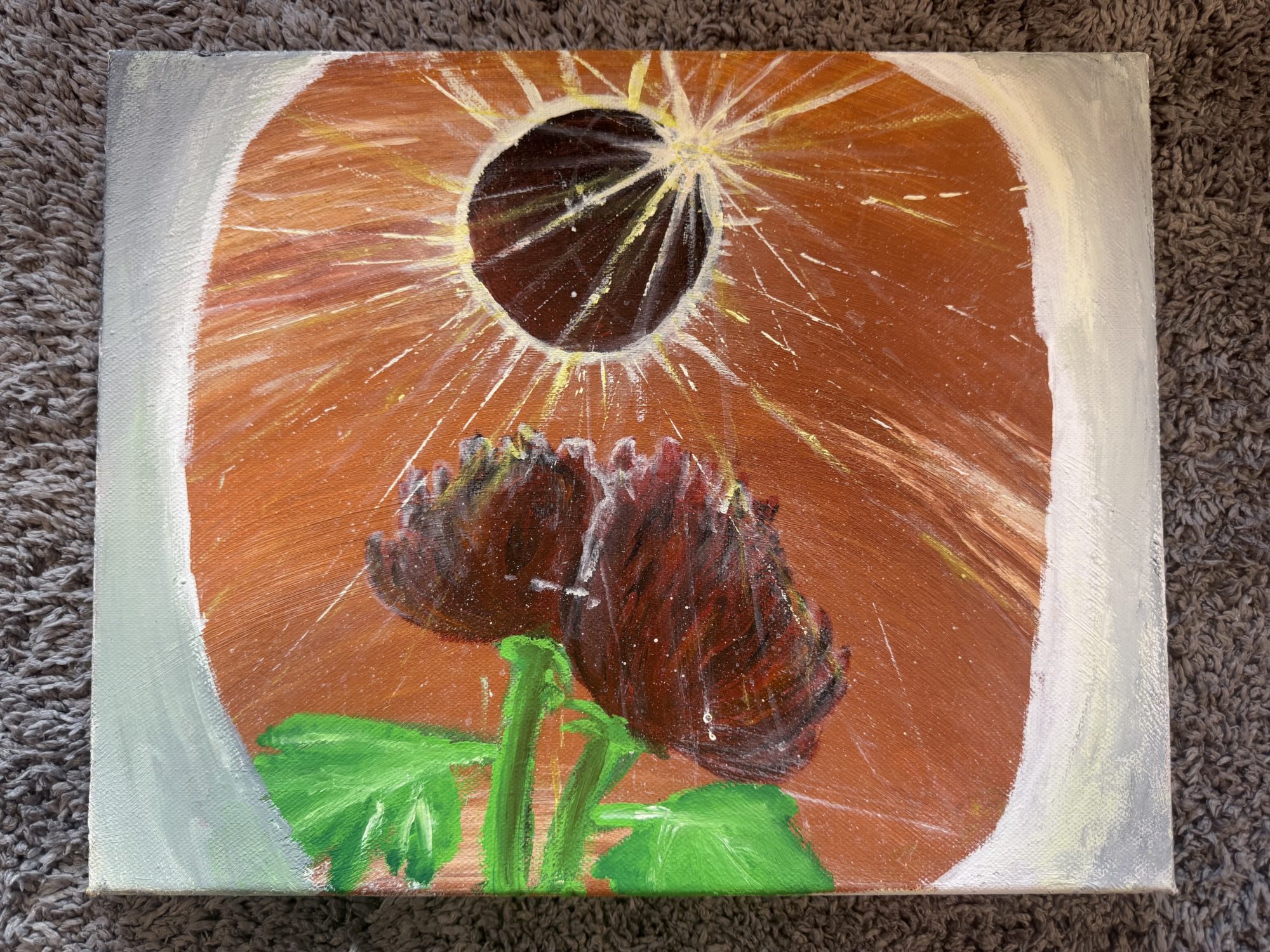 私の叔母が結婚するので、プレゼントする絵を描いてみました!喜んでくれるかな…赤い花は赤い菊で赤い菊の花言葉は「あなたを愛してます」らしいです!後ろの輪っかは、日食を描きました!日食はあの輪っかが婚約指輪に見えるし、太陽と月が重なる、つまり愛し合う2人を表したいと思って描きました!ちなみにこれはあまり関係がありませんが、「月が綺麗ですね」の本当の意味は「あなたが好きです」のような告白系らしいです!