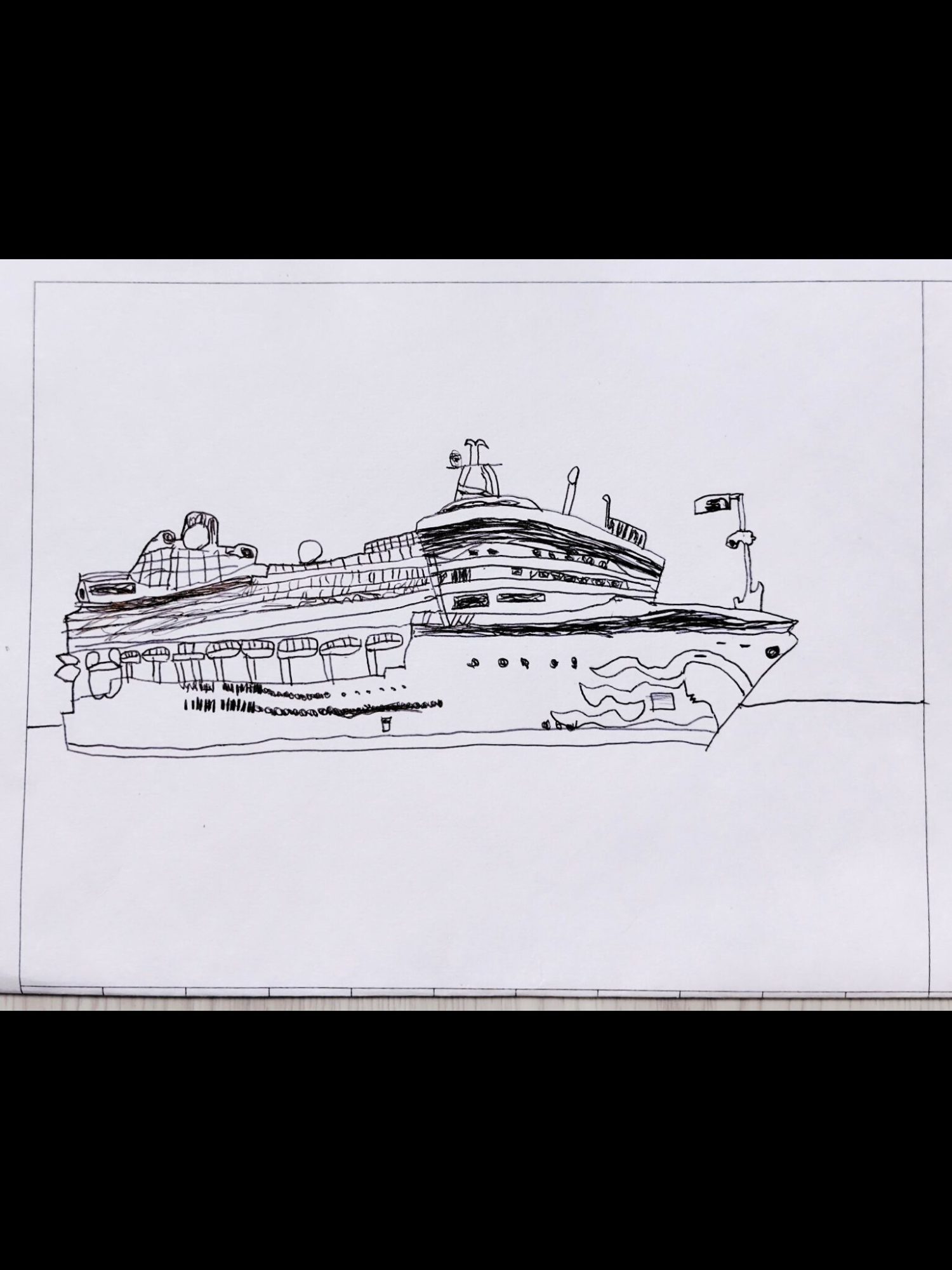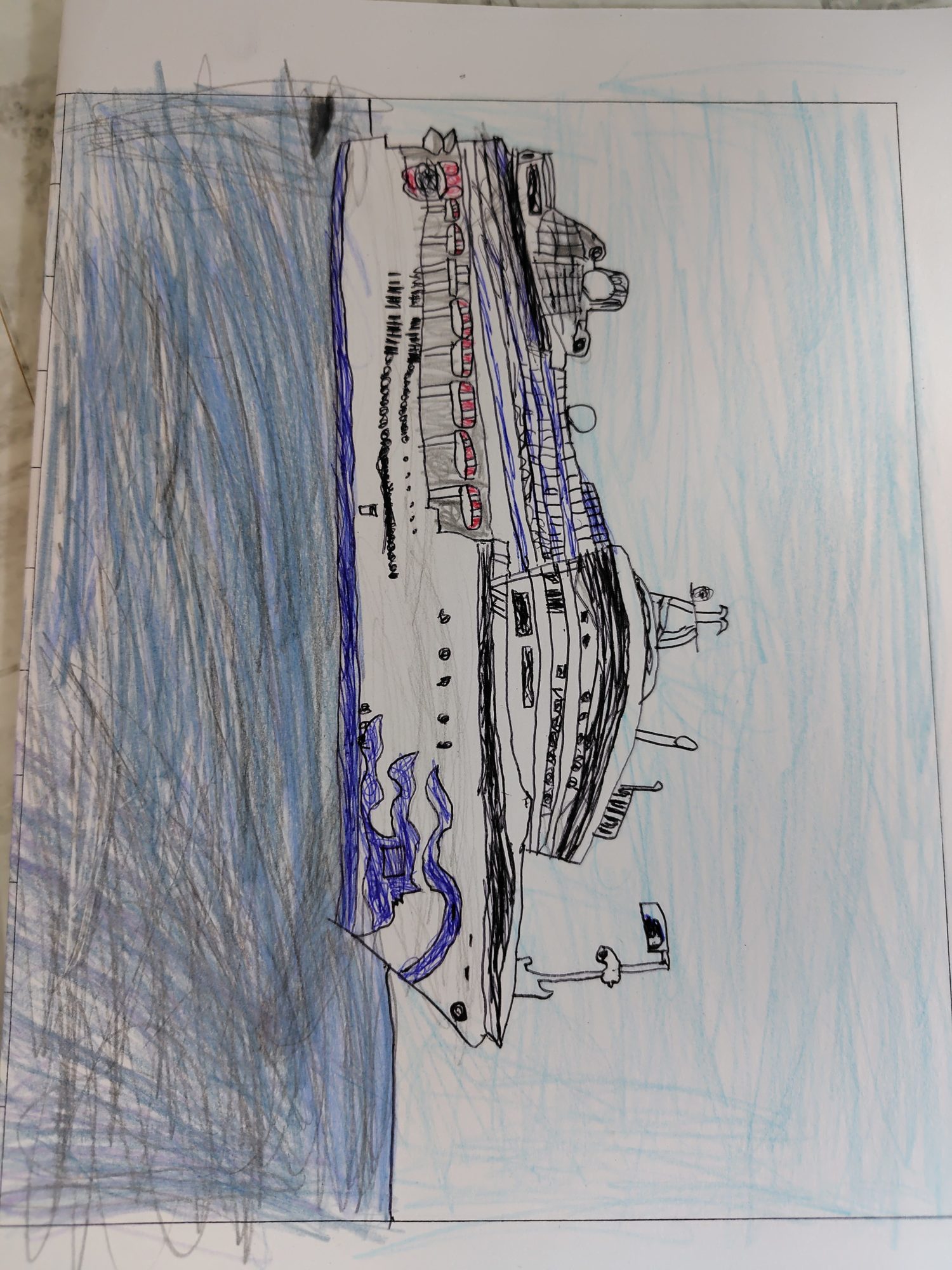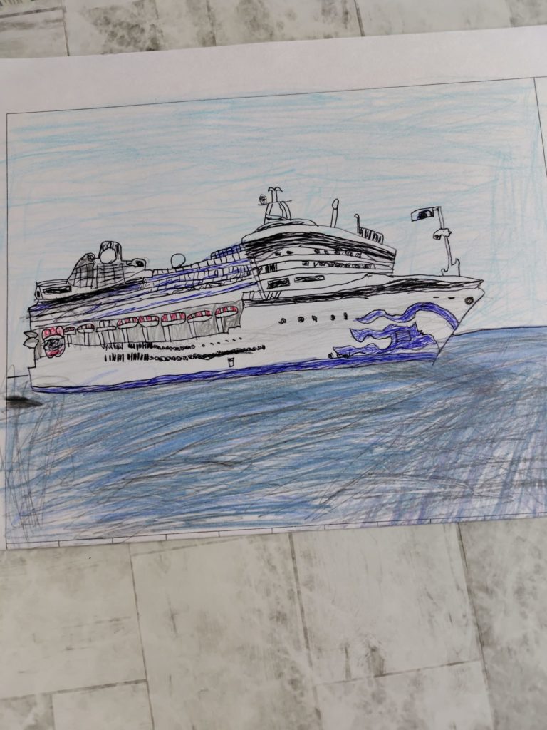 大きな客船を前にして、まず「構図をどうしよう?」と考えて、船全体がしっかり画面に収まるように描いたのですね。実際に乗っているときには気づきにくい「全体の大きさ」を、少し離れて観察して捉えているところがとても素晴らしいです。