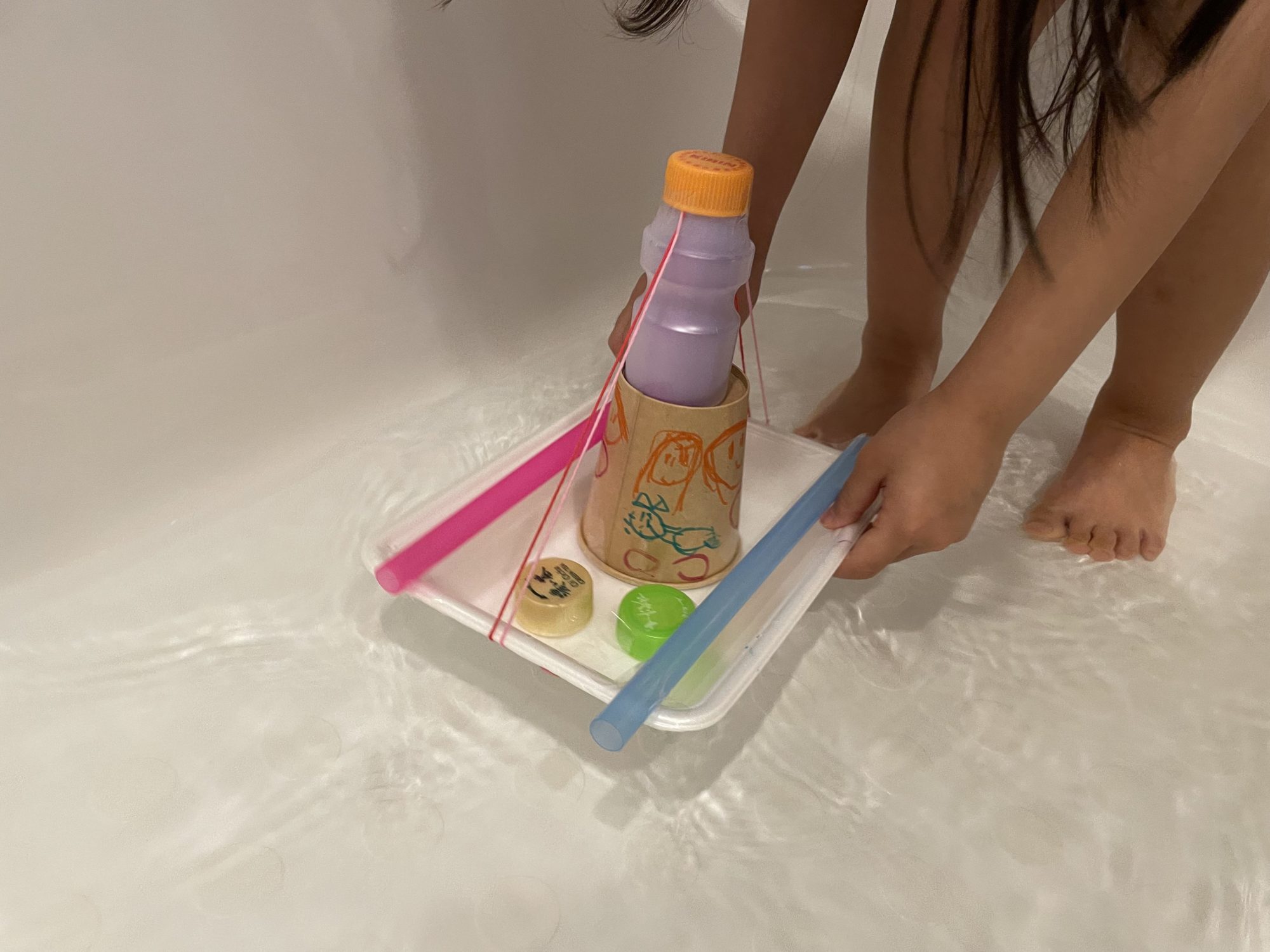 おふろにうかべて遊んでいる写真から、さらさんのワクワクが伝わってきました。おもちゃをのせたり、物語をつくったり…まさに本物の探検船のよう!