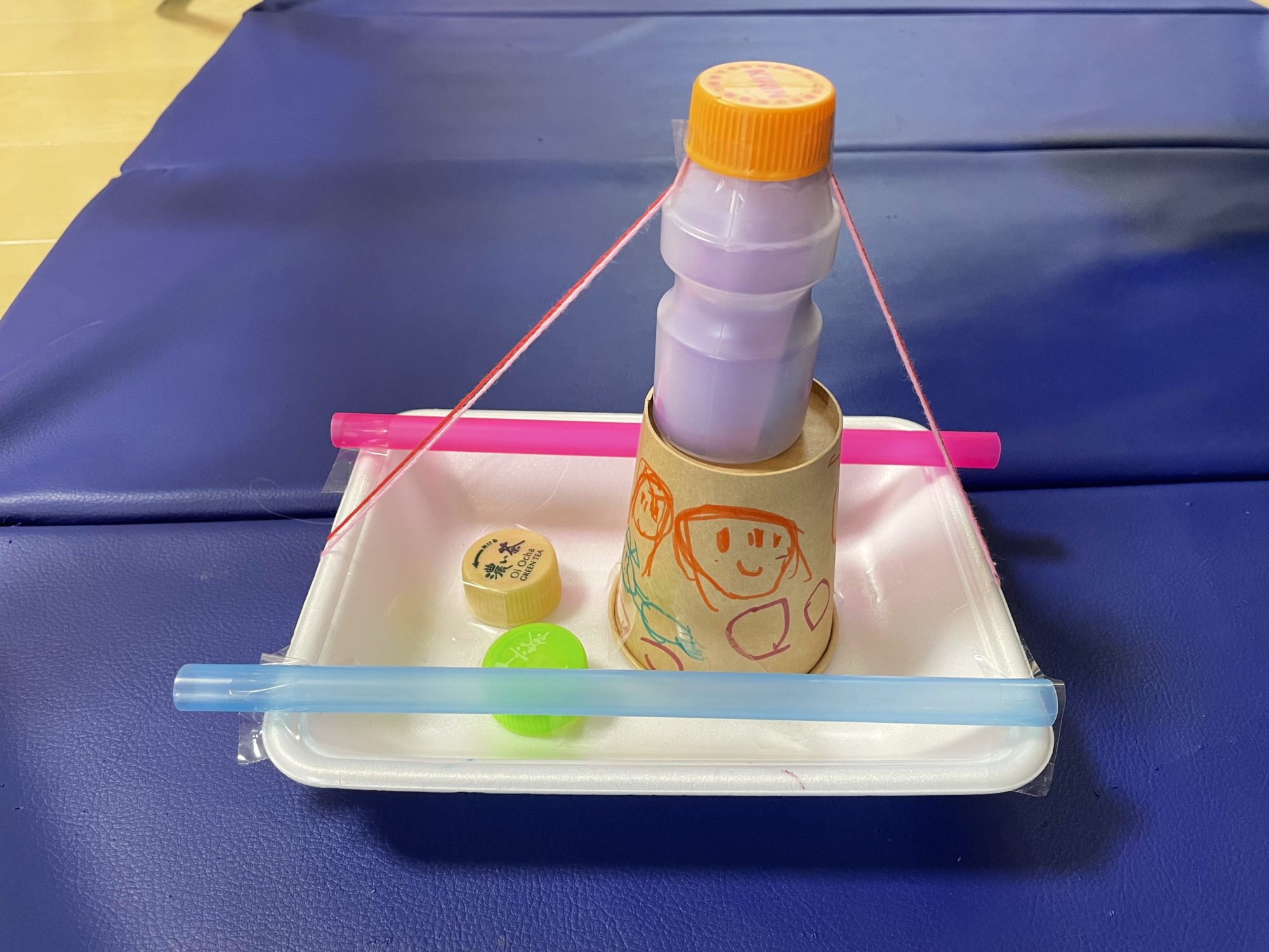 ストローやカップをくみあわせて、しっかり船のかたちになっているのがすばらしいです。テープでとめるのはむずかしかったと思うけれど、工夫してしっかり作れましたね。