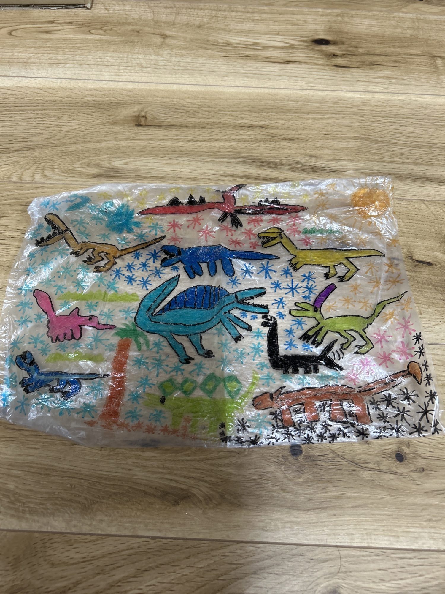 年長のとき、ビニール袋に油性ペンで絵を描くことにハマっていました!この中には12匹の恐竜がいます!真ん中のスピノサウルスがイチオシです!