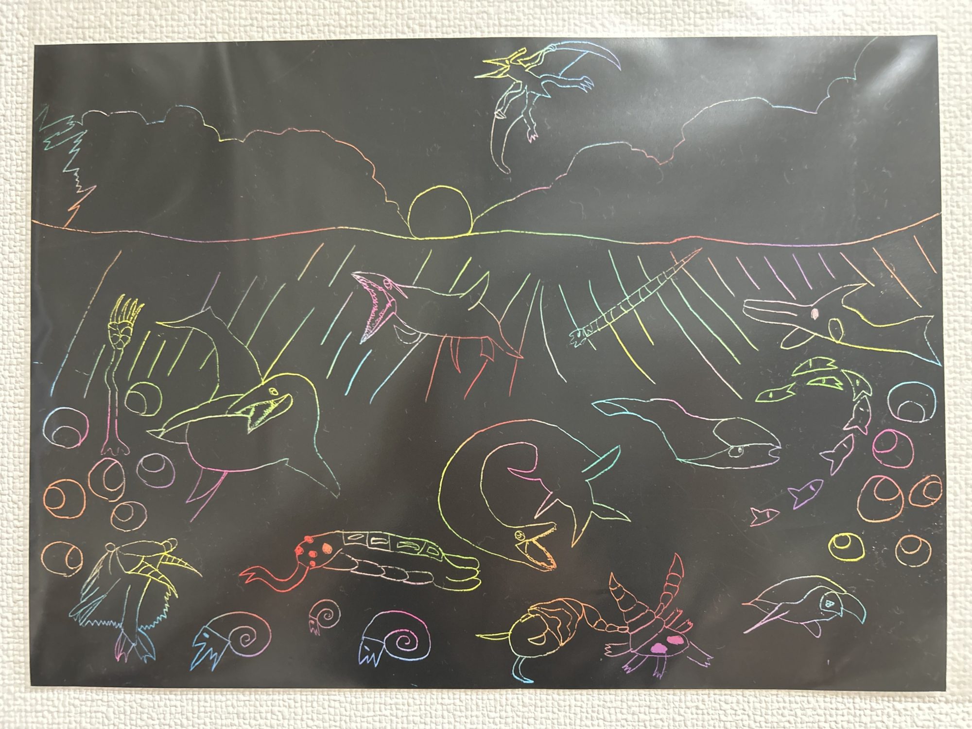 100均のスクラッチをすると綺麗な色の出るシートで太古の海を描きました。水面下には右からイクチオサウルス、魚、アーケロン、アランダスピス、エンドセラス、エラスモサウルス、ユーリプテルス、ファコプス、クロノサウルス、オパビニア、アンモナイト、モササウルス、パラクリヌス、アノマロカリス、丸いのはブクブクです。空にはプテラノドンがいます。想像しない色が出てくることが面白かったです。尾びれの描き方がよくわからなくて難しいです。