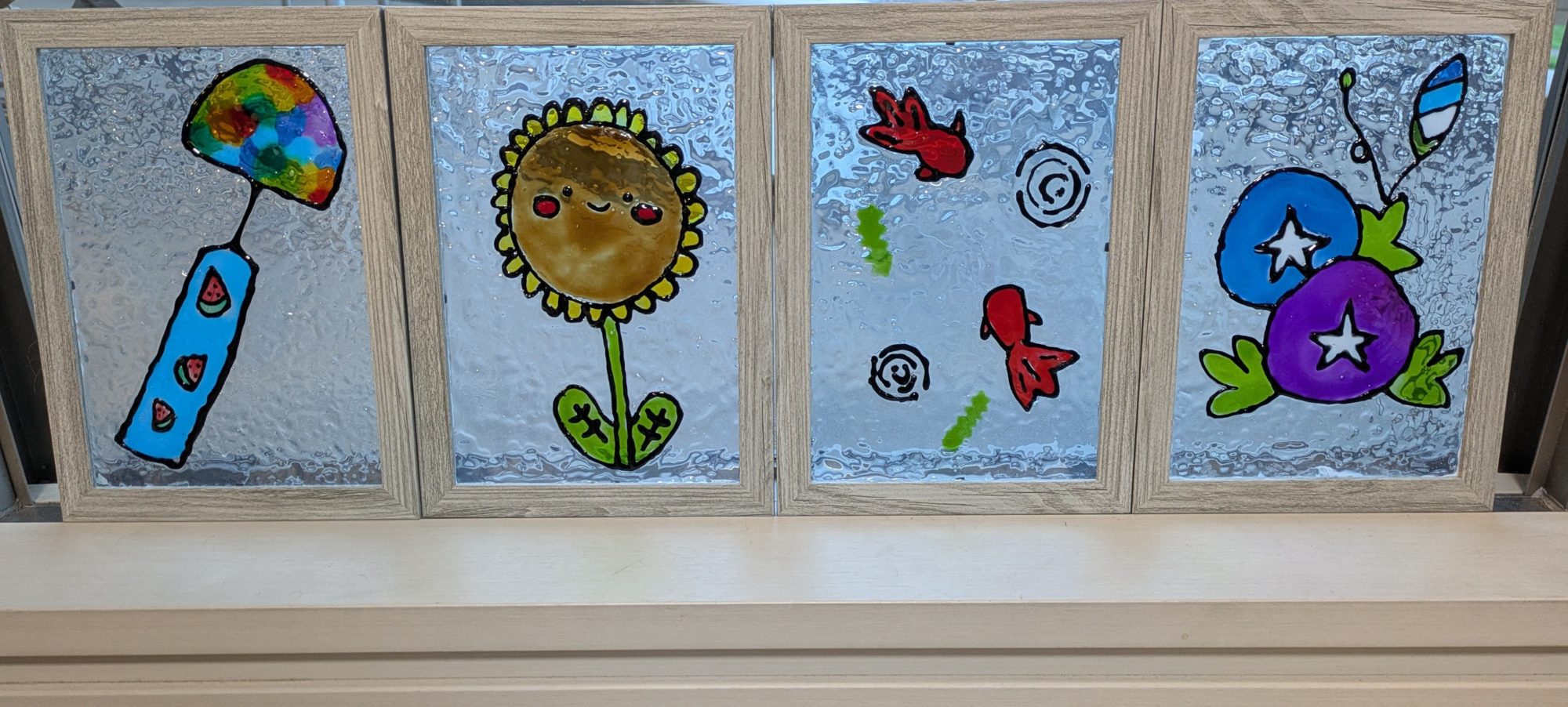 風鈴にはスイカの模様、にこにこ顔のひまわり、金魚の泳ぐ涼しげな水の中、そして朝顔の花、、どれも夏を代表するイメージで、とてもバランスよく配置されています。光を通したときに、ガラス絵の具の鮮やかさがいっそう際立ち、手作りならではのあたたかさが感じられますね。