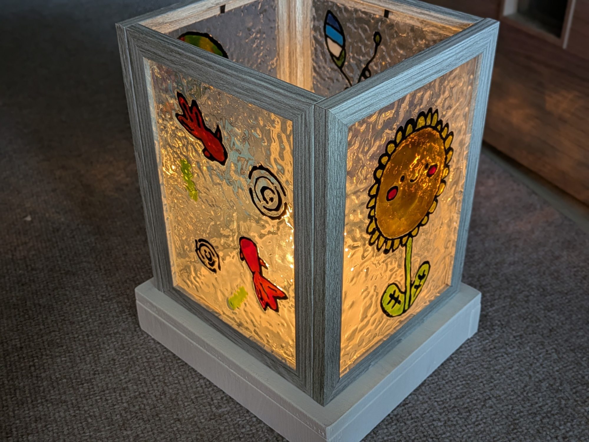 ガラス絵の具とレジン液を使って、ステンドグラス風のランプを作りました。