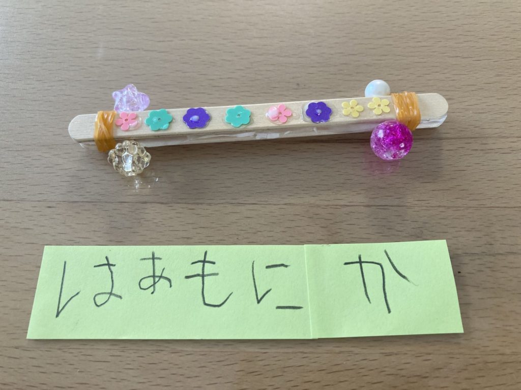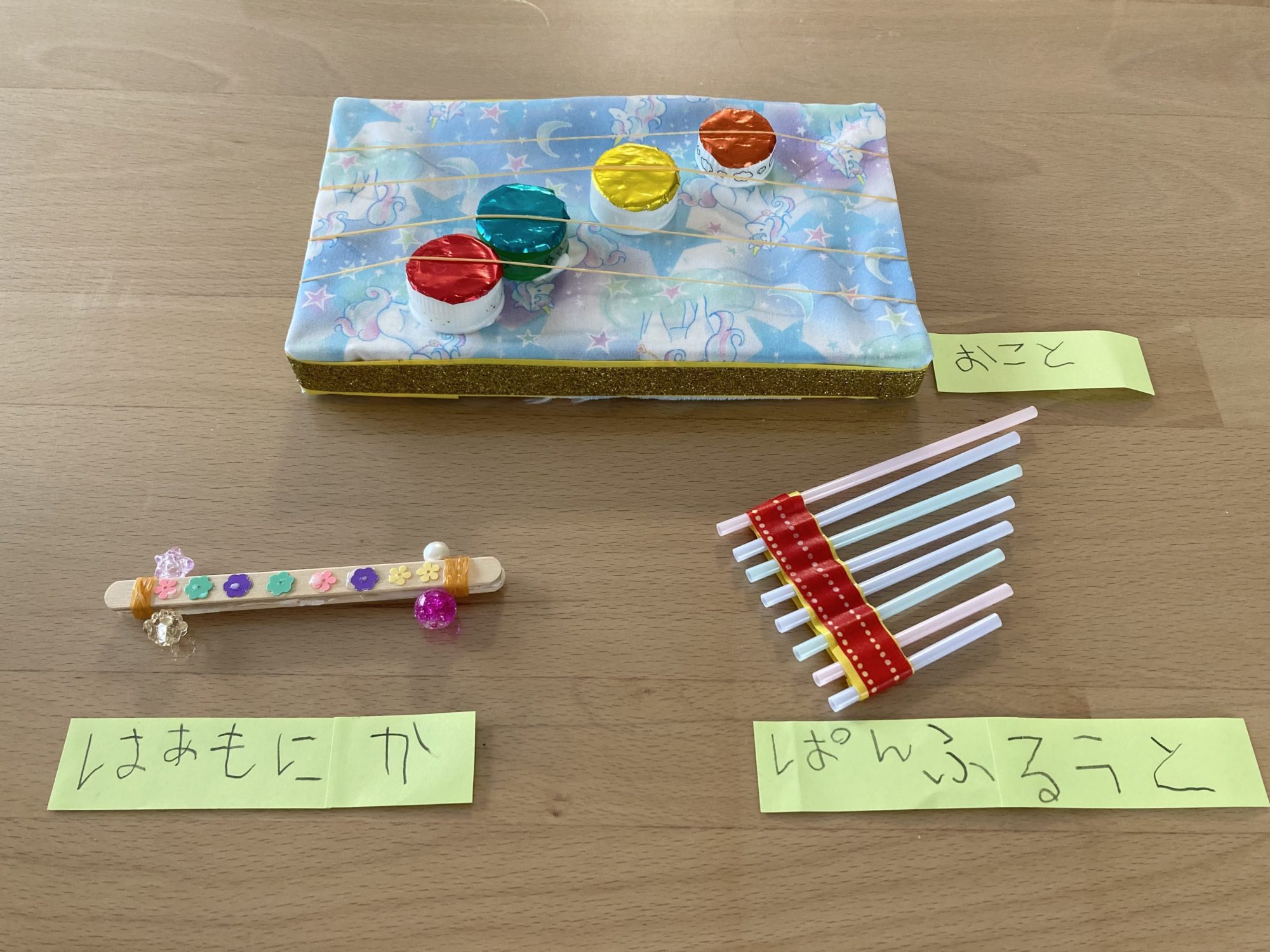 箱やキャップ、ストロー、アイスの棒など、身近な素材を使って工夫しながら、まるで本物の楽器のように仕上げているのがすばらしいです。お琴のきらきらした布やキャップの色合いがとてもきれいで、見るだけでもワクワクしますね。パンフルートは長さによって音が変わる工夫がよく表れていて、本当に演奏できそう。ハーモニカもかわいらしくデコレーションされていて、ユーモアたっぷりです😆