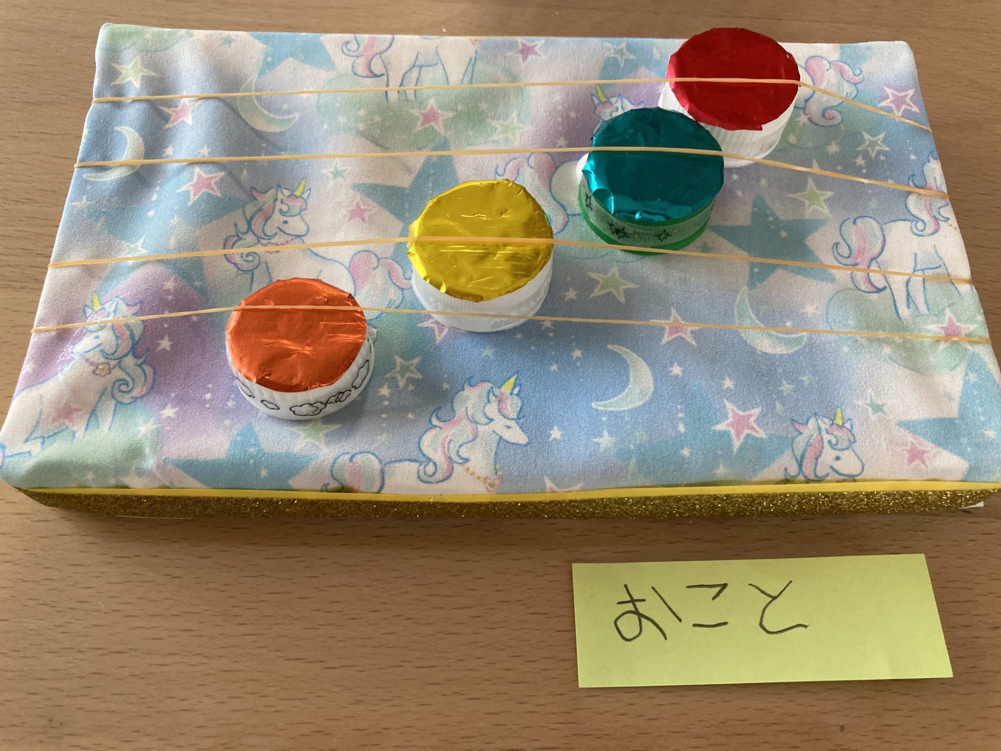 お琴は可愛くデコレーションした箱に、ペットボトルのキャップ、輪ゴムをかけて作りました。