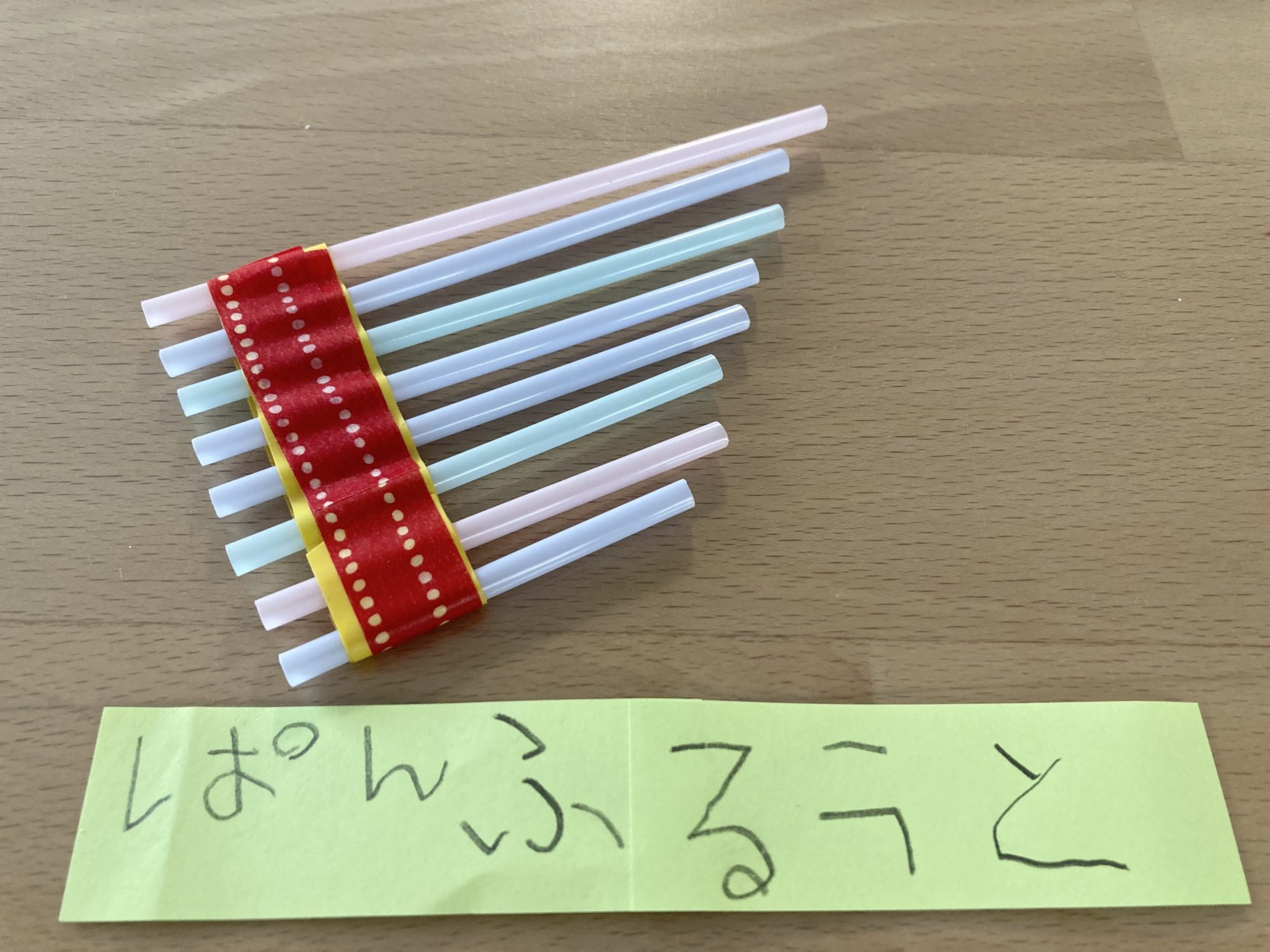 パンフルートは長さの違うストローを順番に並べてテープでとめました。
