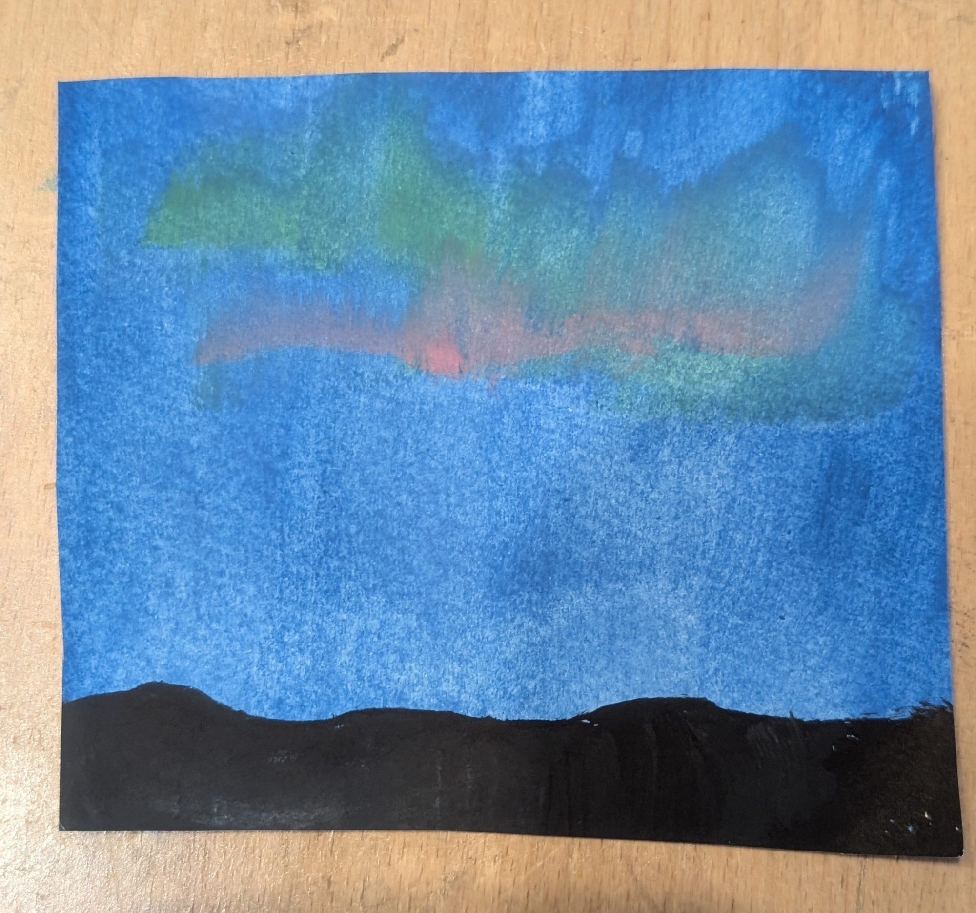 メラミンスポンジを使って色を重ねる工夫が、ふんわりとした光のにじみを表現していて、本物の空にゆらめくオーロラを見ているようです。夜空の深い青と、地平線の黒があるからこそ、上の色がより鮮やかに浮き上がって見えますね。