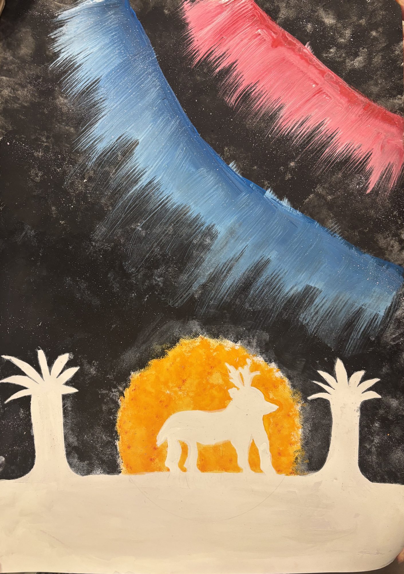 オーロラを歯ブラシで描いたことで、光の筋が自然に広がっていて、本当に夜空を見上げているような迫力がありますね。鹿のまわりの太陽(夕日?)のようなオレンジ色も強い存在感を放っていて、静かさと力強さが同居しているように感じました。