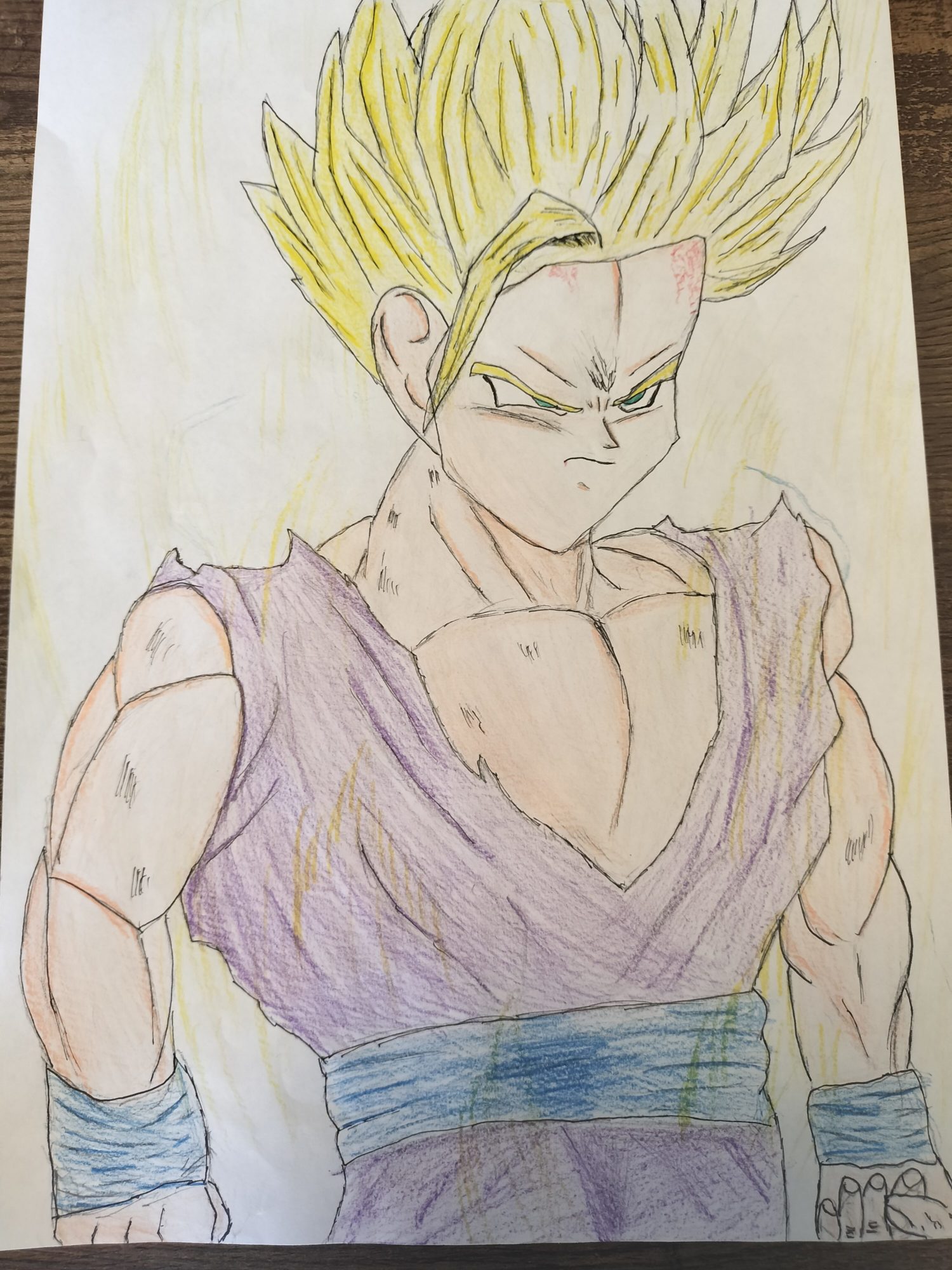 色について「少し薄くなった」と書かれていましたが、逆にそれが悟飯の気のオーラや光に包まれた雰囲気を感じさせてくれて、作品に合っていると思いました。影のつけ方も工夫されていて、筋肉の立体感や服の厚みがしっかり表現できていますね。