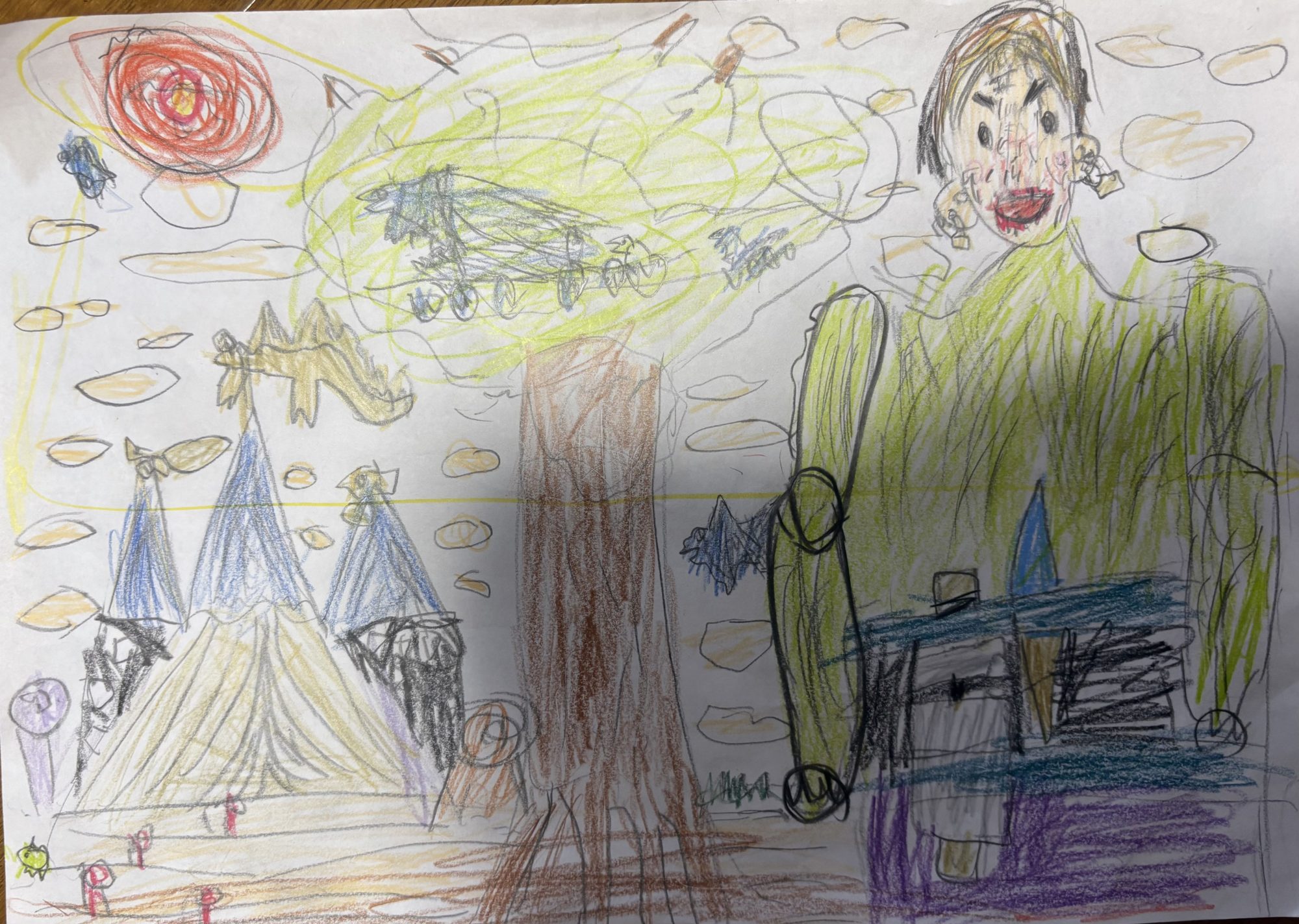 わかめせんせい 先生2025年9月2日 10:45 PM kenkenさん、これは本当に“力作”ですね!🔥 画面ぜんぶに物語がぎっしり入っていて、描いているときの気持ちの熱さが伝わってきました。 作品を見ての勝手な印象??解釈ですが・・ •左側のお城:青い三つのとんがり屋根、手前へ続く階段と小さな赤いポールが“お城までの道のり”をはっきり見せています。上空を ドラゴン が横切っていて、緊張感が増していますね。ぐるぐる描きの赤い太陽も、物語のエネルギー源みたいで印象的! •まんなかの大きな木:太い幹と黄緑の茂みの中に、ちゃんと 鳥と巣 が見えます。巣のまわりを飛ぶ小さな鳥、さらにその近くに 車輪のついた乗り物みたいな影 があって、「自然」と「機械」が同じ空にいる世界観が面白いです。落ち葉のような楕円が空一面に散っていて、風の流れまで感じました。 •右の“力の強い人”:太い肩、ひじや手首を示す黒い円、胸元の四角いパーツ…装備のディテールがすごい!きゅっと上がった 眉 と赤い 口 は、守り抜く覚悟の表情に見えます。腰の青い装置や、背後の小さな青い屋根のモチーフが、左側のお城と呼応していて画面がまとまっています。 この一枚は、遠くの城+大樹+巨人という三つの大きな要素のスケール差が気持ちいい!視線が左下から右上へ、そして空へと流れていきます。 👉 きいてみたいこと: この“力の強い人”は お城を守る騎士?それとも鳥たちの 見張り役? 木の上の“車輪のある飛行体”は仲間なのか、敵なのか…kenkenさんの設定をぜひ教えてください! 聞きたいことがたくさんあって・・モヤモヤします。 ログインして返信する ↓