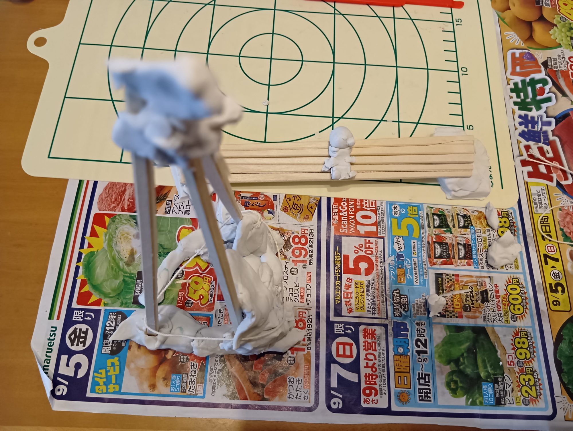ペンギンが暮らすテントや橋を発想したのもユニークで、物語を感じさせますし、最後にベンチを壊してテントの幕にしてしまうのも、制作に夢中になっている証拠ですね。失敗ではなく、遊びながら変化させていくプロセスそのものがアートの楽しさだと伝わってきます。