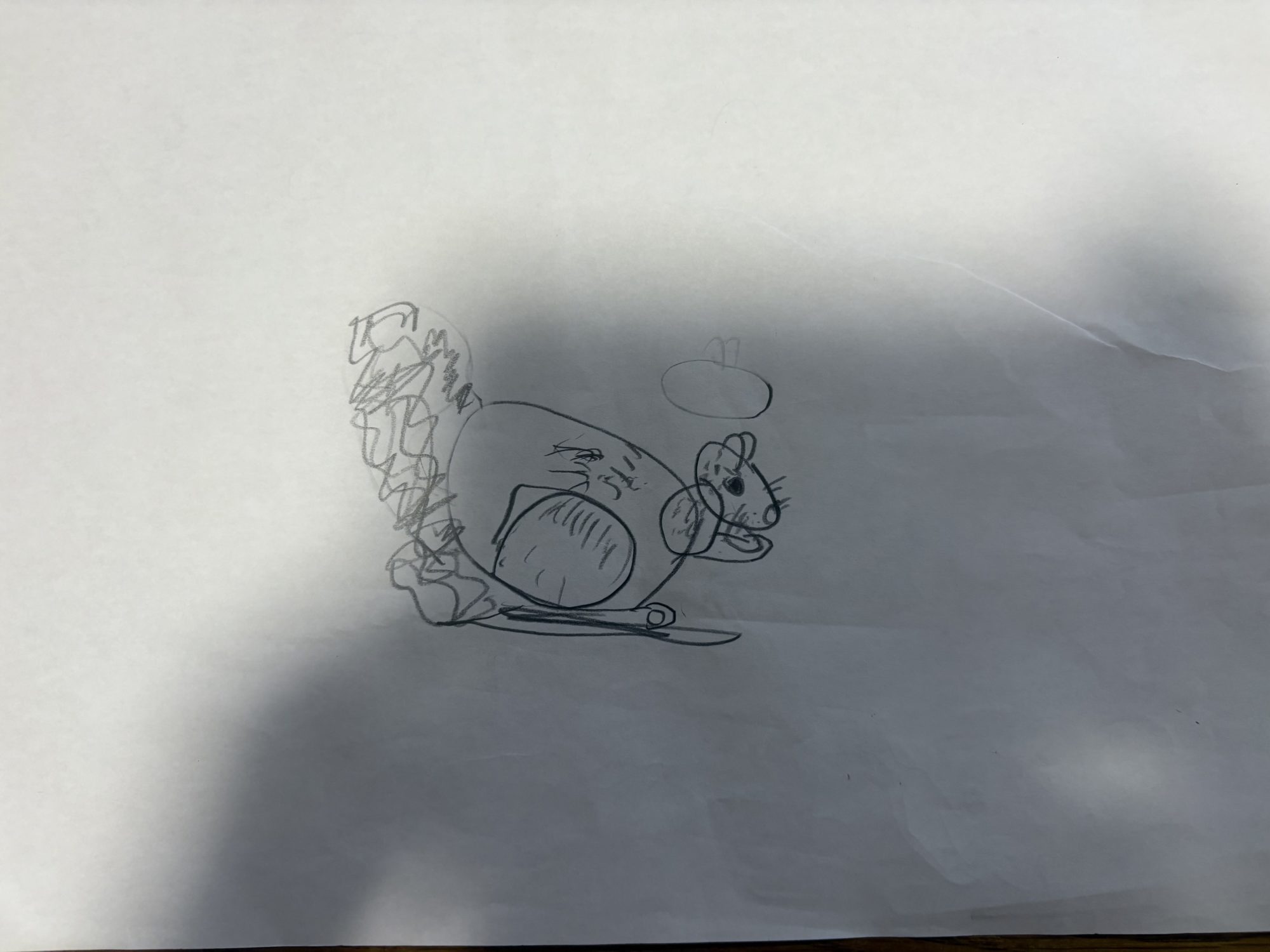 特にリスのしっぽの毛のもじゃもじゃ感を鉛筆で工夫して表しているところ、観察力と表現力がしっかり結びついていますね。りんごの丸みに影をつけたり、にんじんやたけのこの形を描き分けたりと、「どうやったら本物らしくなるかな?」という探究心が伝わってきます。