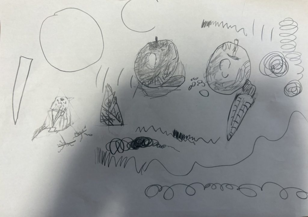 リスや果物の絵、とてもよく観察して描かれていて素晴らしいです!🐿🍎🥕