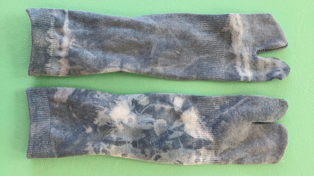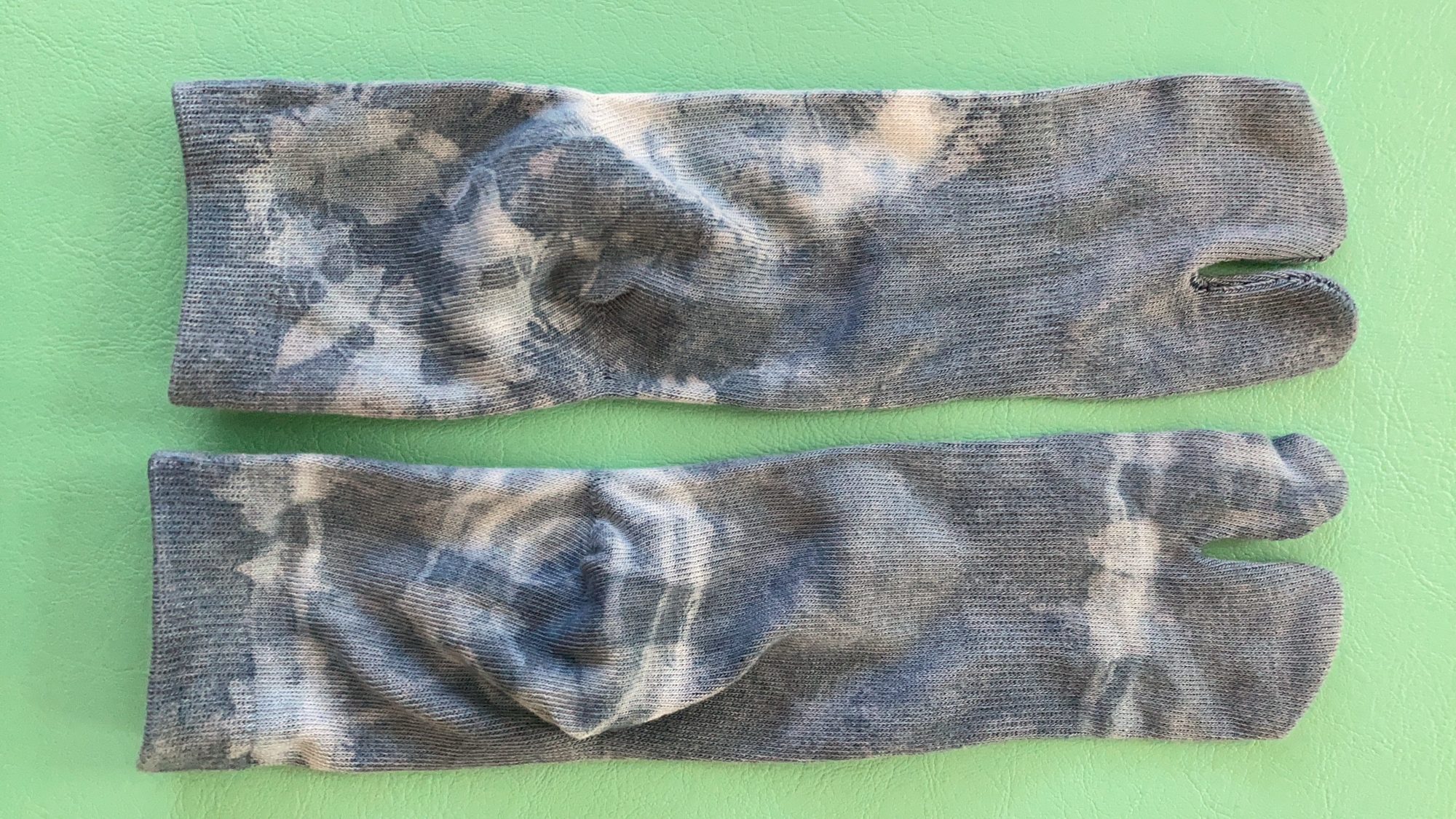 Tシャツは深い青の中にやわらかな渦模様が浮かび上がり、まるで空と海が交差する瞬間を切り取ったようです。靴下のデザインも左右で表情が違っていて、まさに一点ものの魅力が出ています。藍の濃淡や偶然生まれる模様が、作り手の感性と重なって味わい深い仕上がりになっていますね。