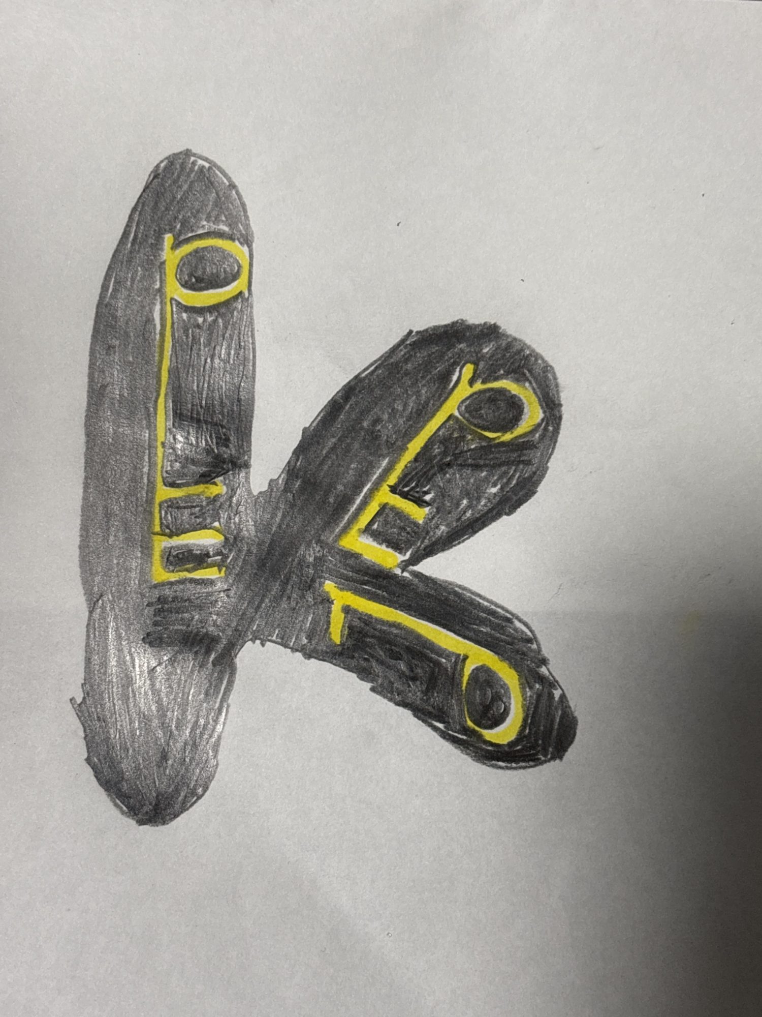 黒でしっかり塗りつぶすのは本当に大変だったと思いますが、その分、黄色の「k」の文字がとてもはっきり浮かび上がって、インパクトのあるデザインになっています。黒と黄色のコントラストは、見る人の目をぐっと引きつけますね。