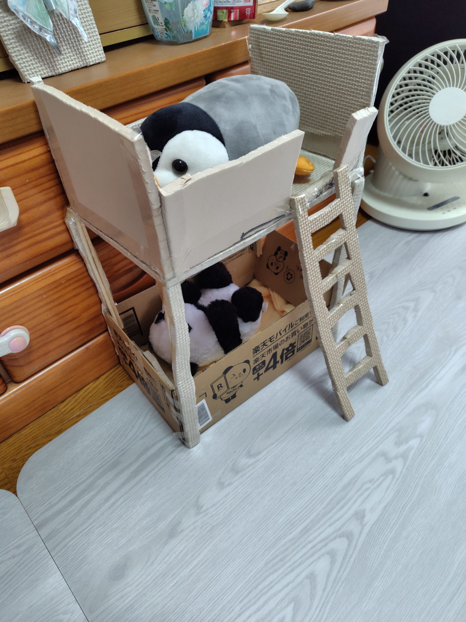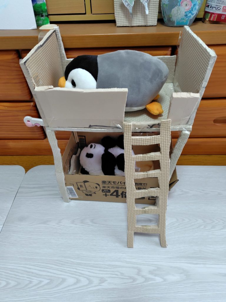 次に、ぬいぐるみの二段ベッド。段ボールとパネルマットを素材に選んだことで、軽くて丈夫なうえに、自分の欲しい形を自在に作り出せるところがとてもユニークです。パンダ専用の一階とペンギンがのんびり休む二階、それぞれにストーリーが生まれていて、まるで小さなお家のようですね🏠🐼🐧。