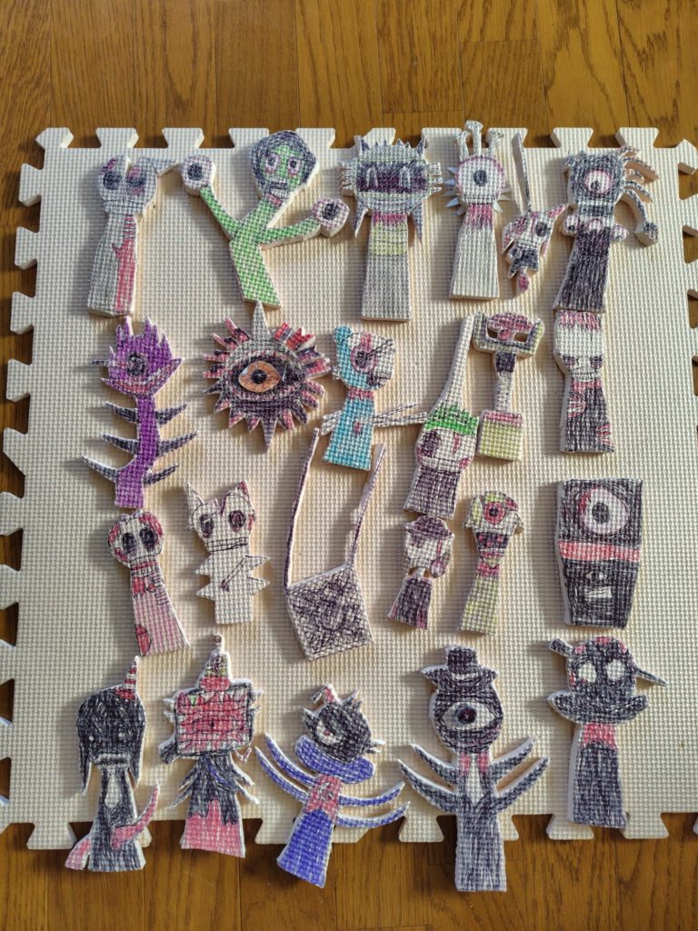 そしてゲームキャラクターたち。ひとりひとり個性を出して描き、切り出して並べることで、まるでゲームの世界から飛び出してきたようです。キャラの表情やポーズの違いも楽しく、けんけんさんの「今の好き」がしっかりと形になっているのを感じました。