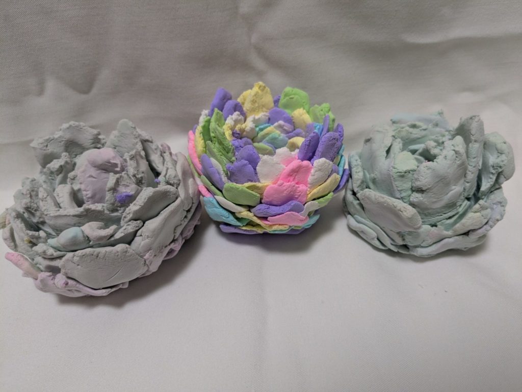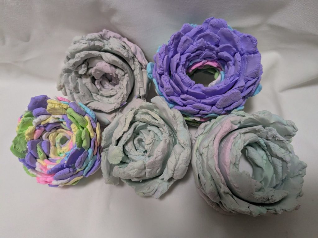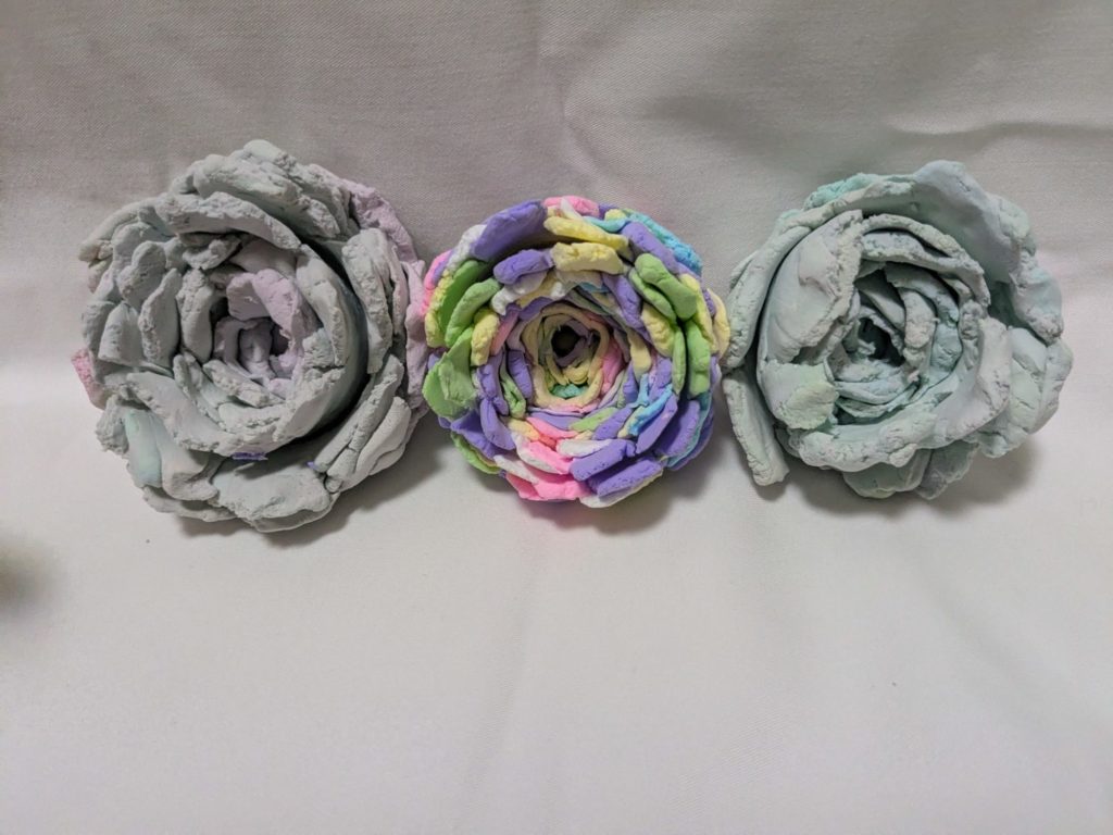 まるで本物の花のように柔らかく、でも存在感のある造形に感動しました。特に、花びらの重なり具合や縁の自然なゆらぎが、粘土とは思えないリアルさを生み出しています。