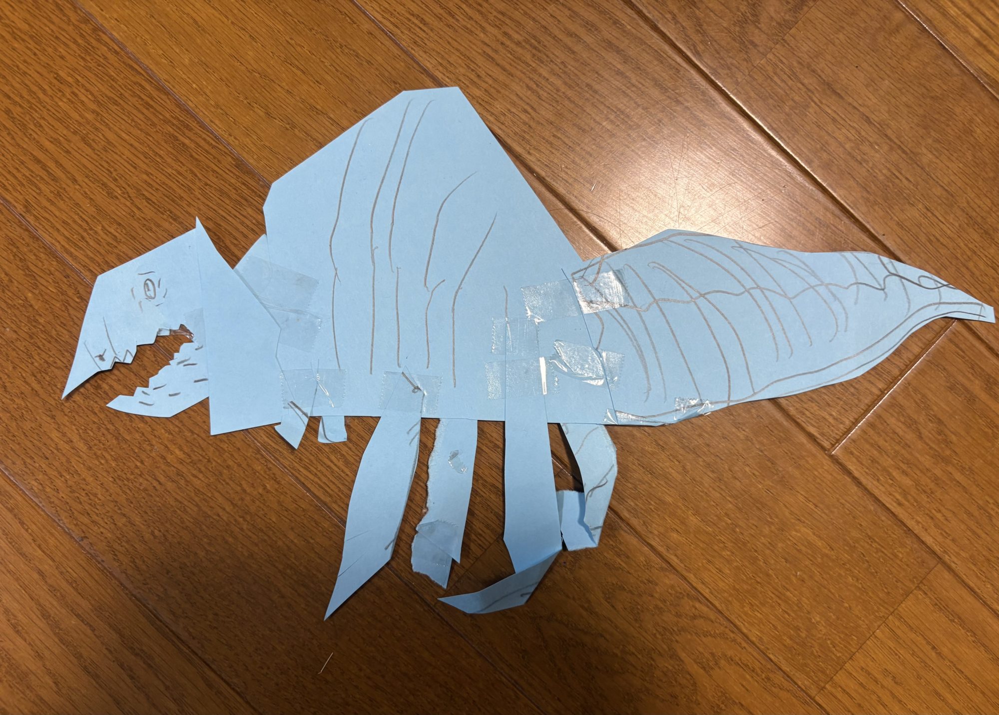 恐竜の工作も、細かく切った足や尾の表現が工夫されていて、「生き物を作りたい!」という気持ちが伝わってきます。紙の立体感と線の描き込みが合わさって、オリジナル恐竜に命が吹き込まれたようです🦖。