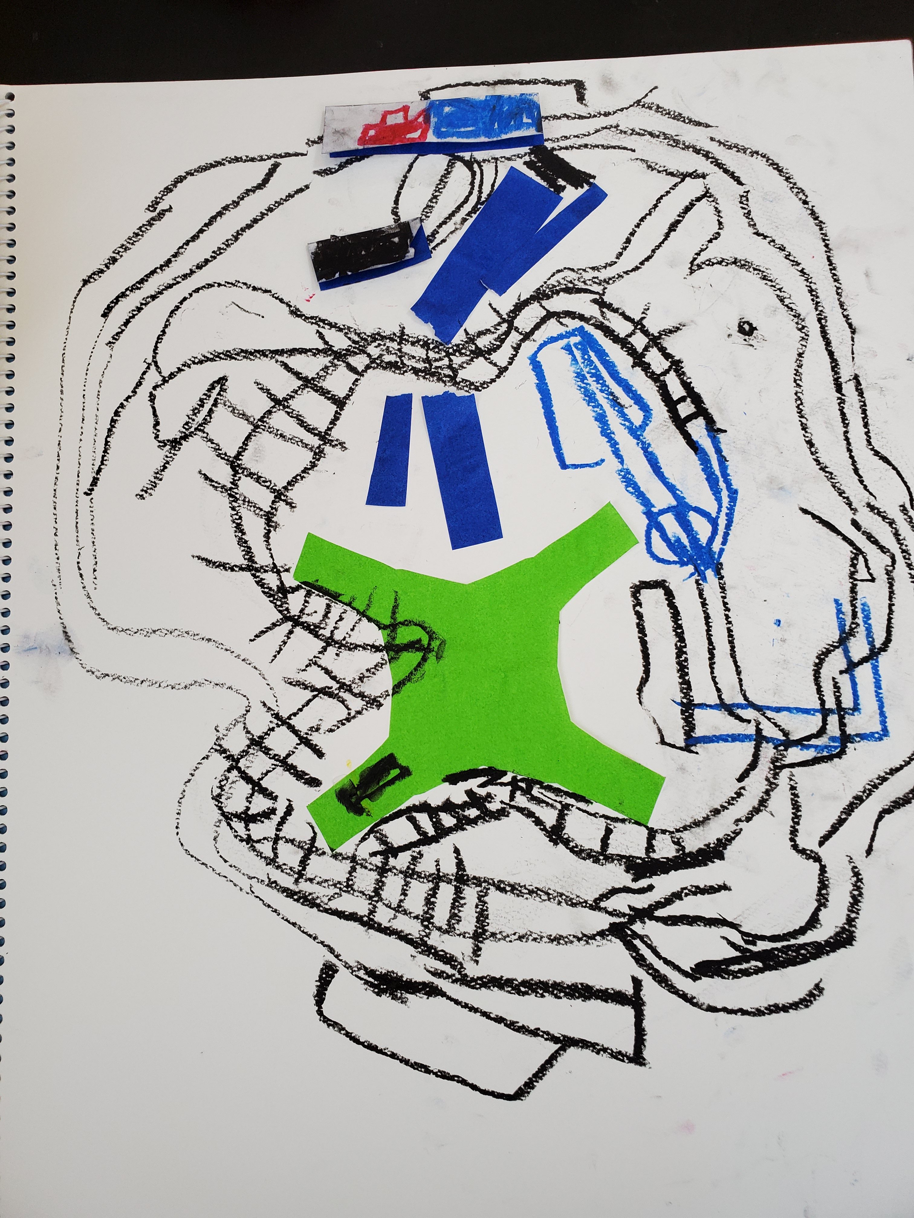 KNTくん、切り抜いた、緑色のおりがみが、かっこいい電車のターミナル駅に見えたよ!!
