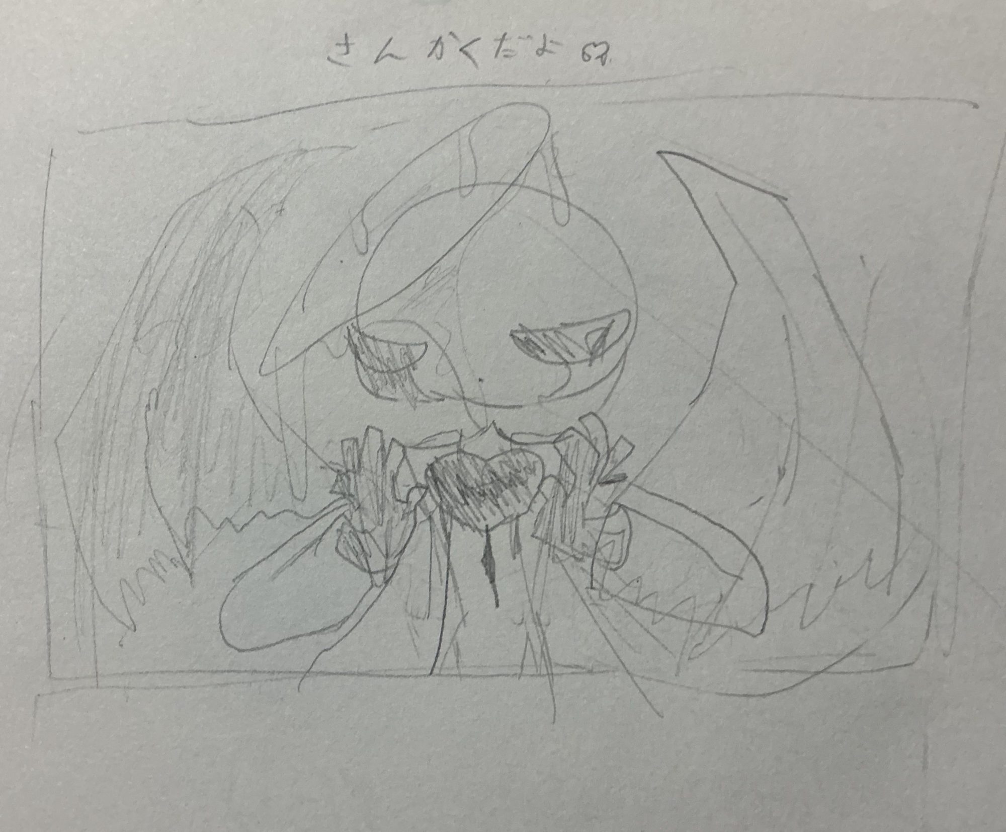 今日はツッチー先生のオンライン講座で、構図について学んだと聞きました。さっそく「三角構図」を意識して描いているのが伝わってきます。キャラクターの両腕や羽の広がりが、三角の形をしっかりつくっていて、画面に安定感がありますね。