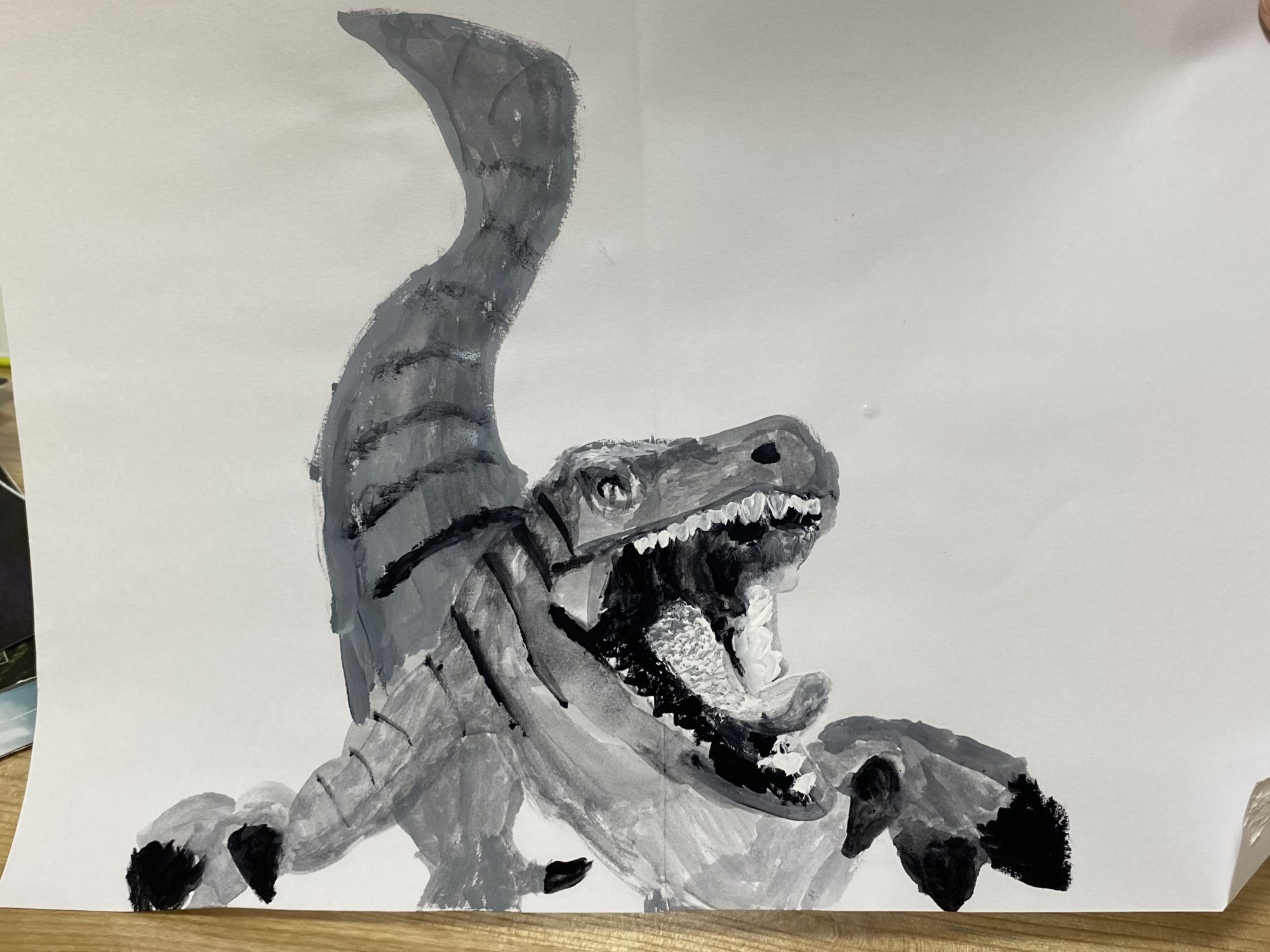 モノクロだけで立体感を出すのは挑戦的ですが、濃い黒と淡いグレーを使い分けて、恐竜の体の筋肉や質感まで表現できているのが素晴らしいと思いましたよ。