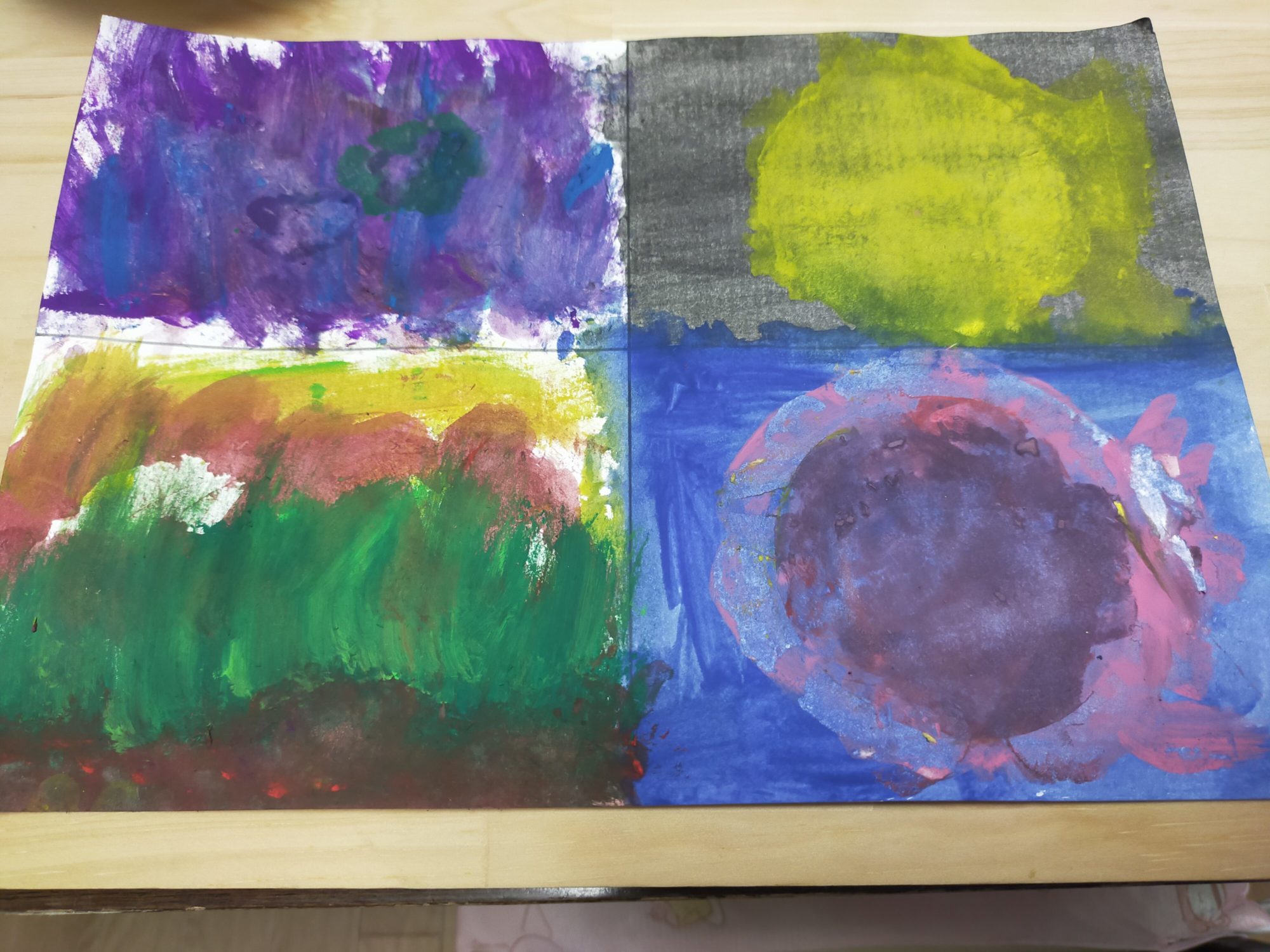 特に、右上の大きな黄色の丸からは強いエネルギーを感じましたし、左下の草原のような緑は安心感をもらえる色合いでした。感情を「描いてみる」というのは、自分の心と向き合う特別な方法だと思います。