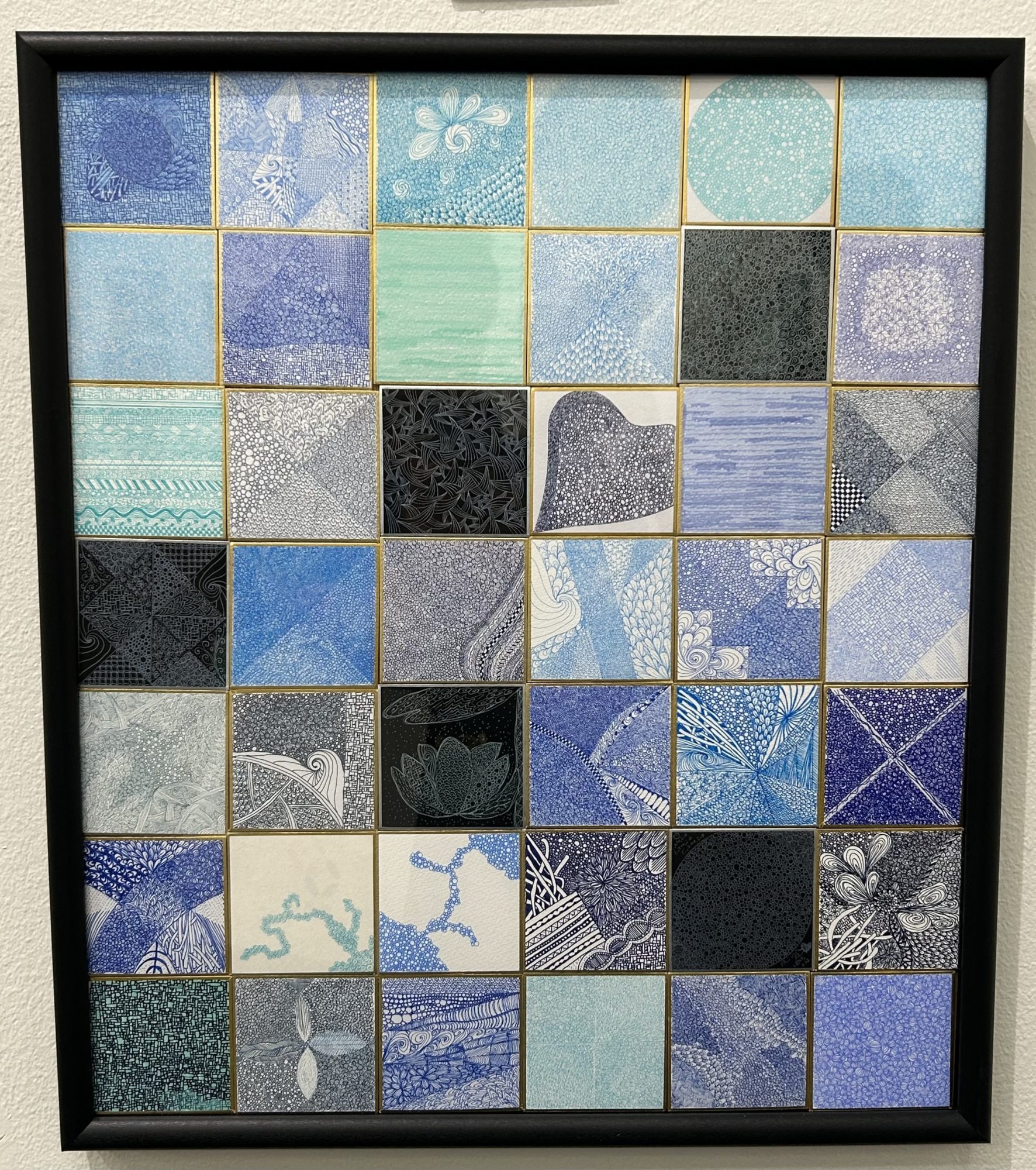 モザイクのように並んだ小さな四角それぞれに、細やかな表情を持った「青」が宿っているのがとても印象的だと感じました。透明感のある淡い青から、深みのある夜空のような青まで、無数のニュアンスが集まってひとつの大きな世界をつくり出していますね。