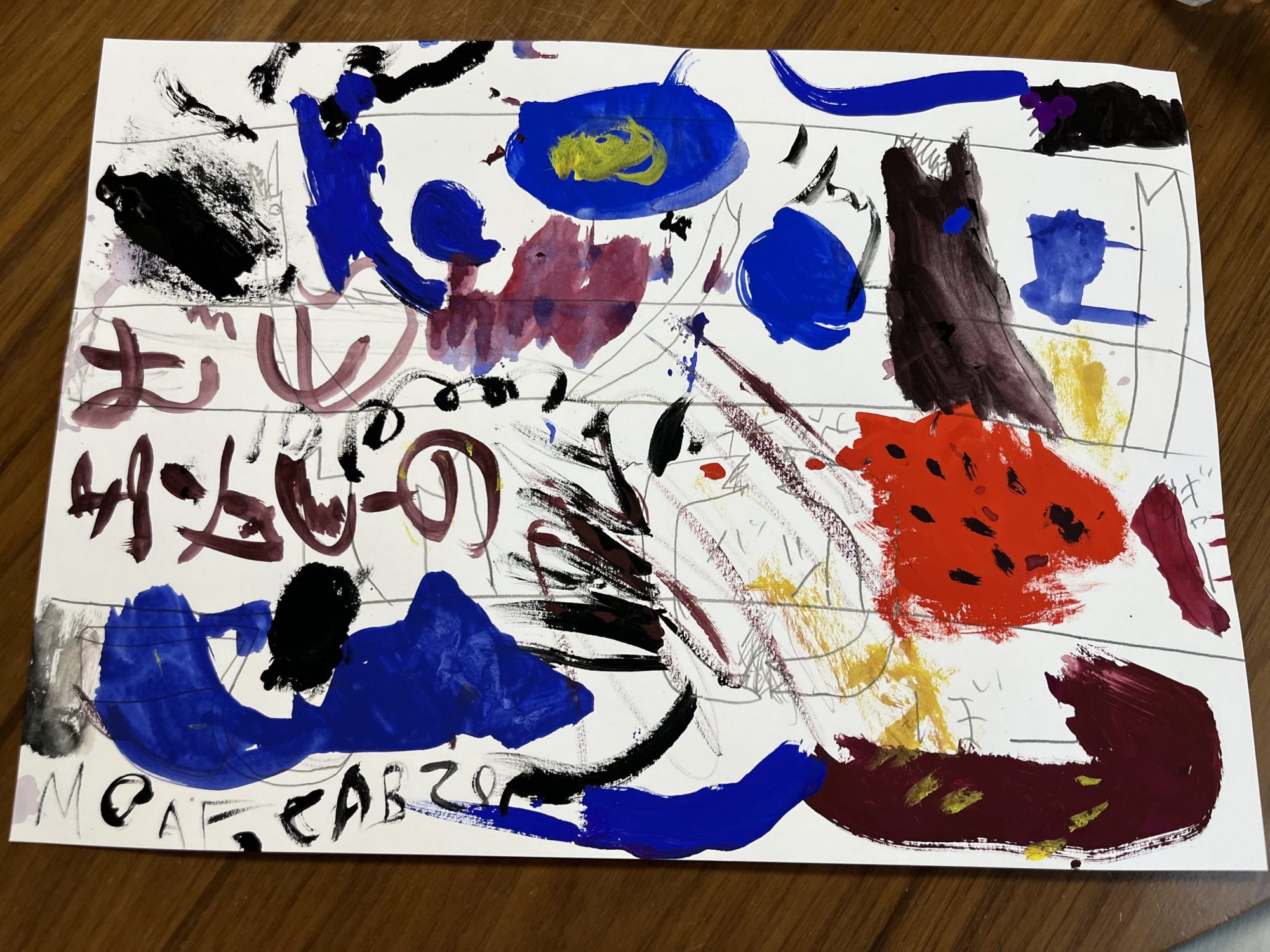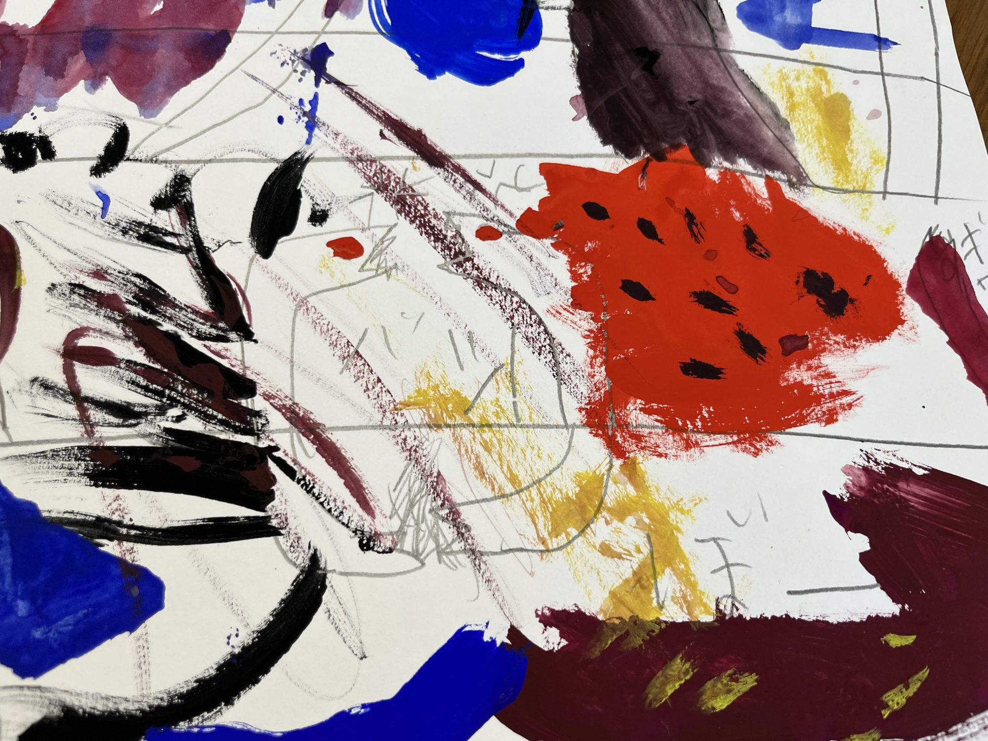 「かいじゅうのむれ」、とても力強くておもしろい絵になりましたね!✨ いろんな色や形が重なり合っていて、それぞれのかいじゅうが動き出しそうに見えます。お気に入りの赤い部分も、すごく迫力があって、見ている人に強い印象を与えてくれますね。