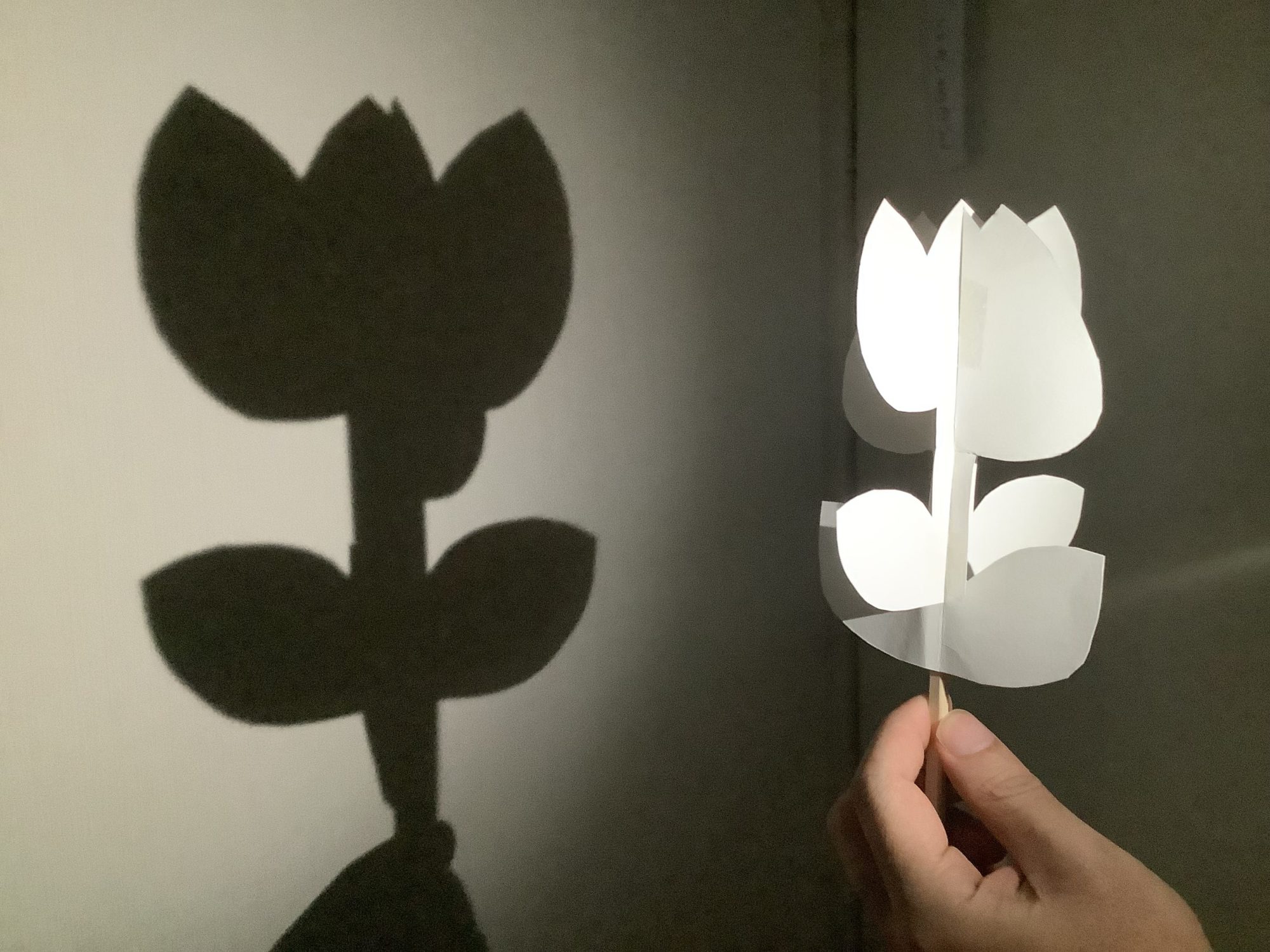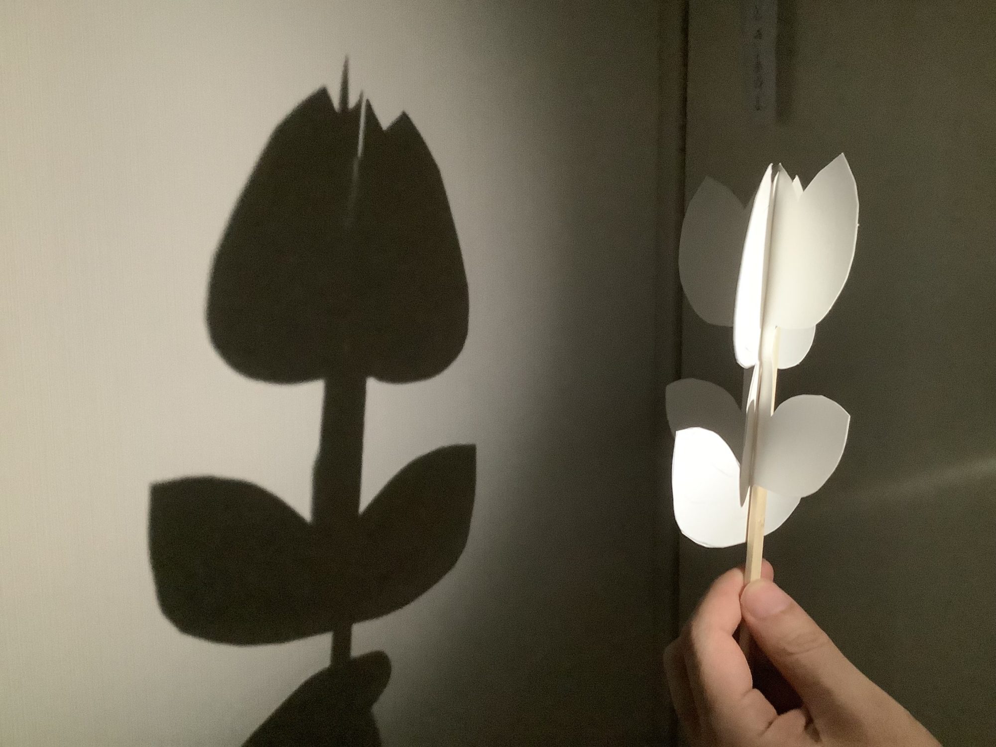 影の形がはっきり見える工夫や、チューリップのつぼみと開花を両方作った点も観察力が光っています。影絵ならではの「想像すると形が変わって見える」楽しさが、見ている人にも伝わってきますよ。