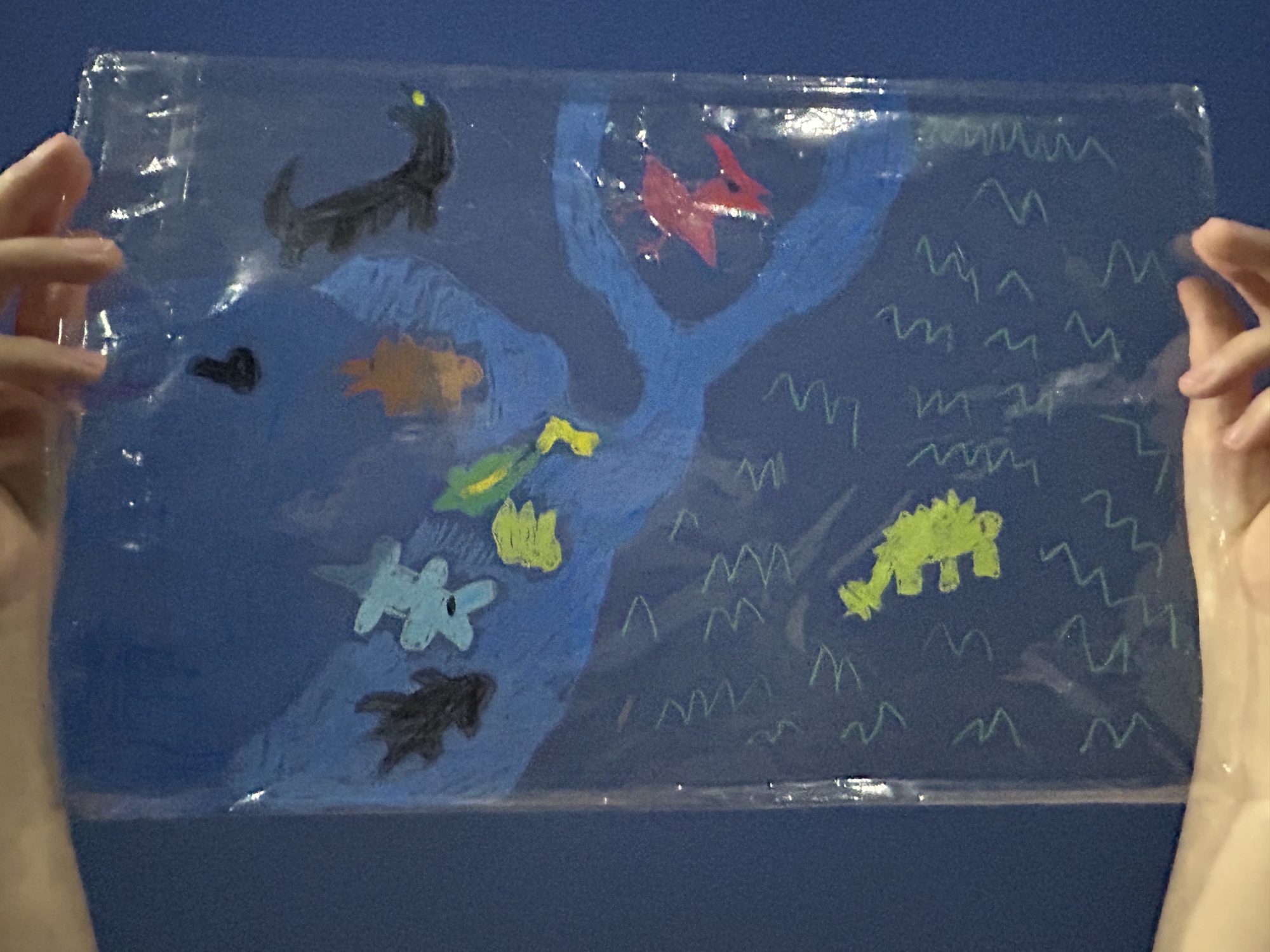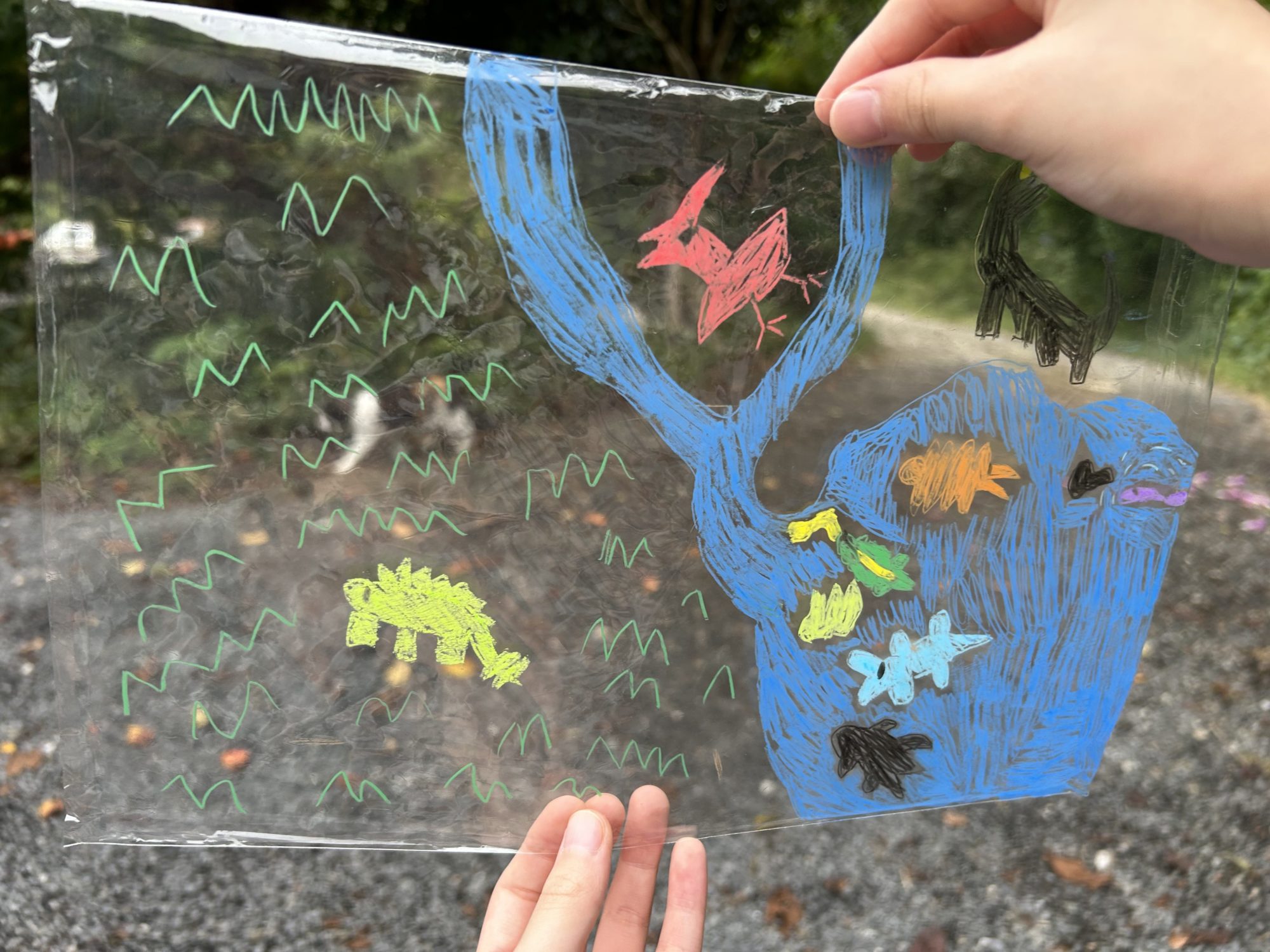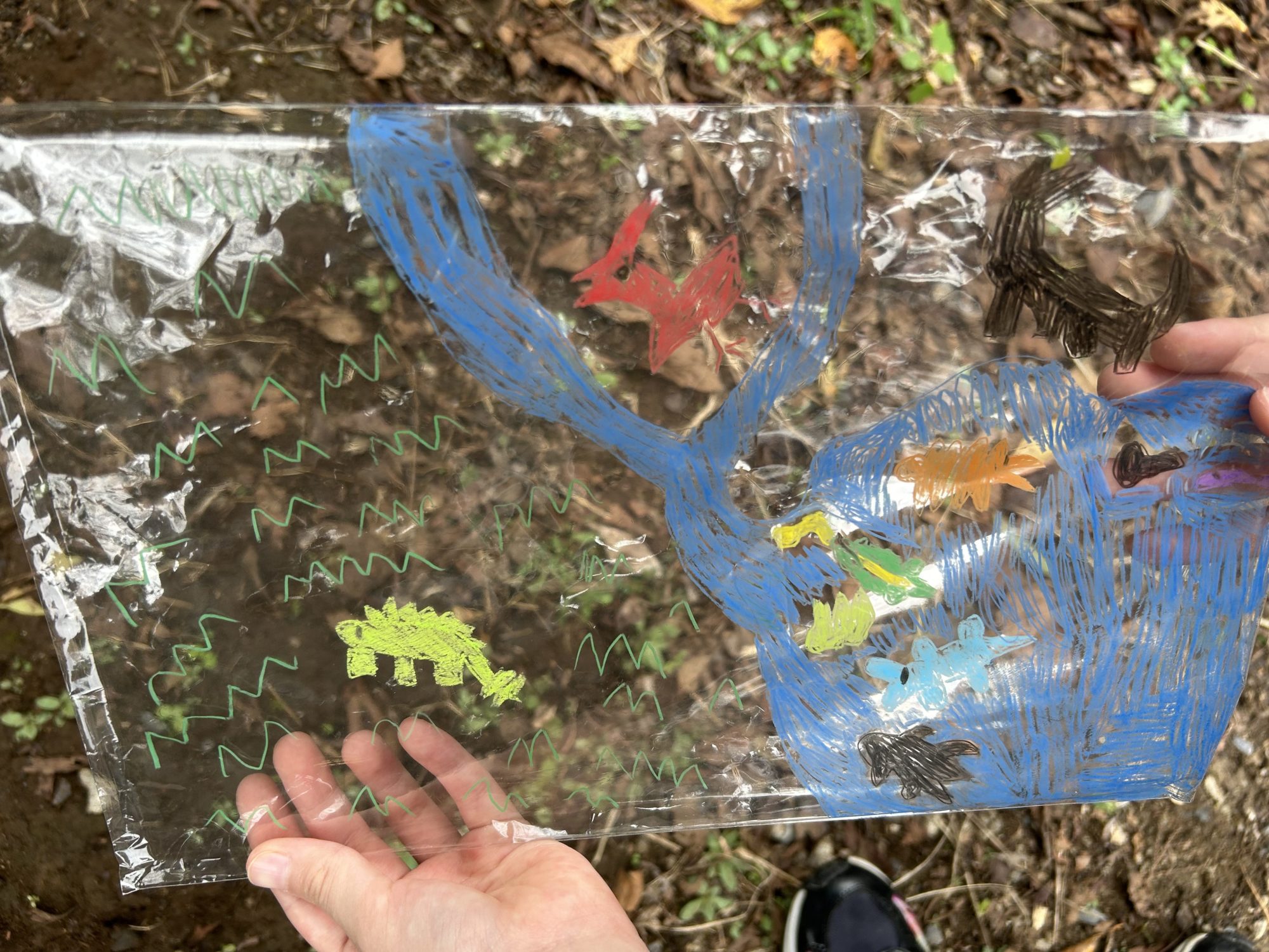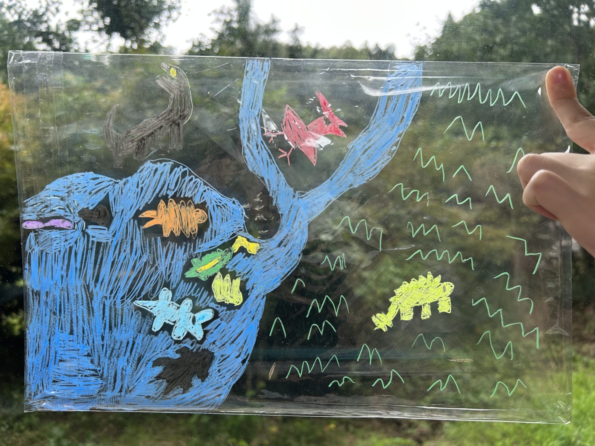 透明なシートに描かれた「うつした世界」、とてもユニークですね。光を通して背景の自然と重なり合うことで、まるで本当に恐竜や古代生物たちが現代の森や川に生きているように見えてきます。特にスピノサウルスが水面から顔を出して波紋を作る表現は、動きと時間を感じさせる素敵な工夫だと思いました。