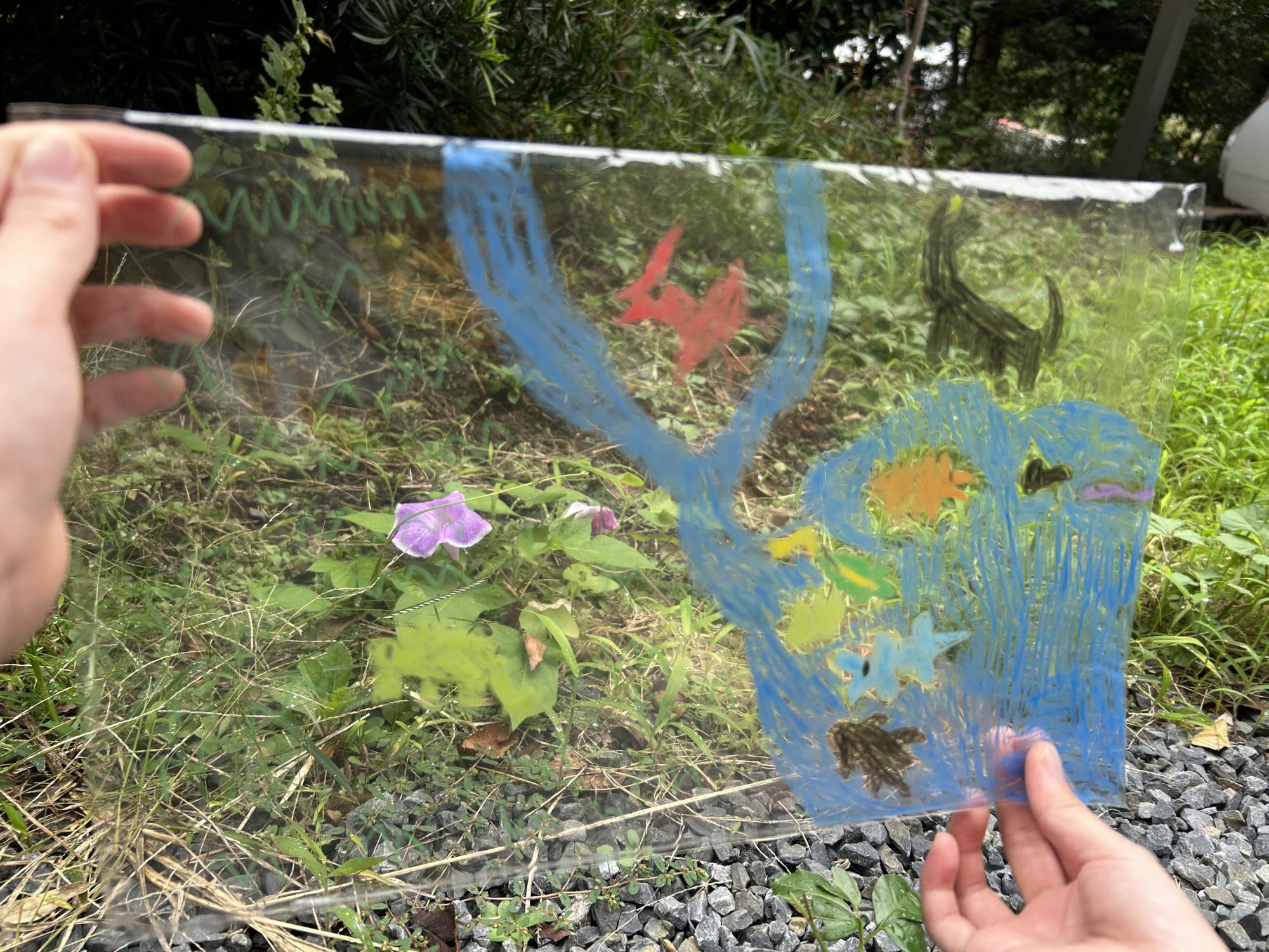 透明な支持体に描くとまるで絵が空に浮かんでいるみたいですね!