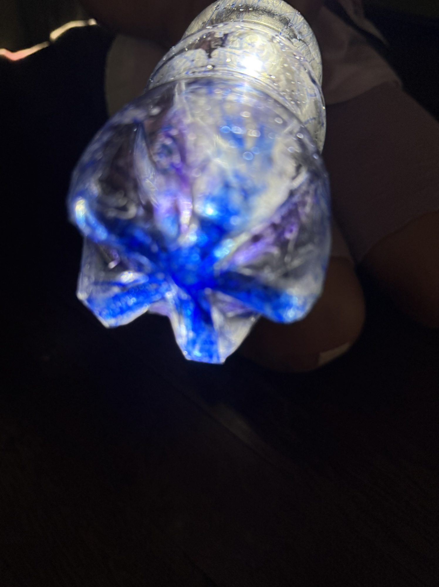 ペットボトルの底からのぞく青い光が、まるで宇宙の星雲のように見えます。光が水の中を通ることで揺らめきや反射が生まれ、それが夜空の奥行きを感じさせていますね。