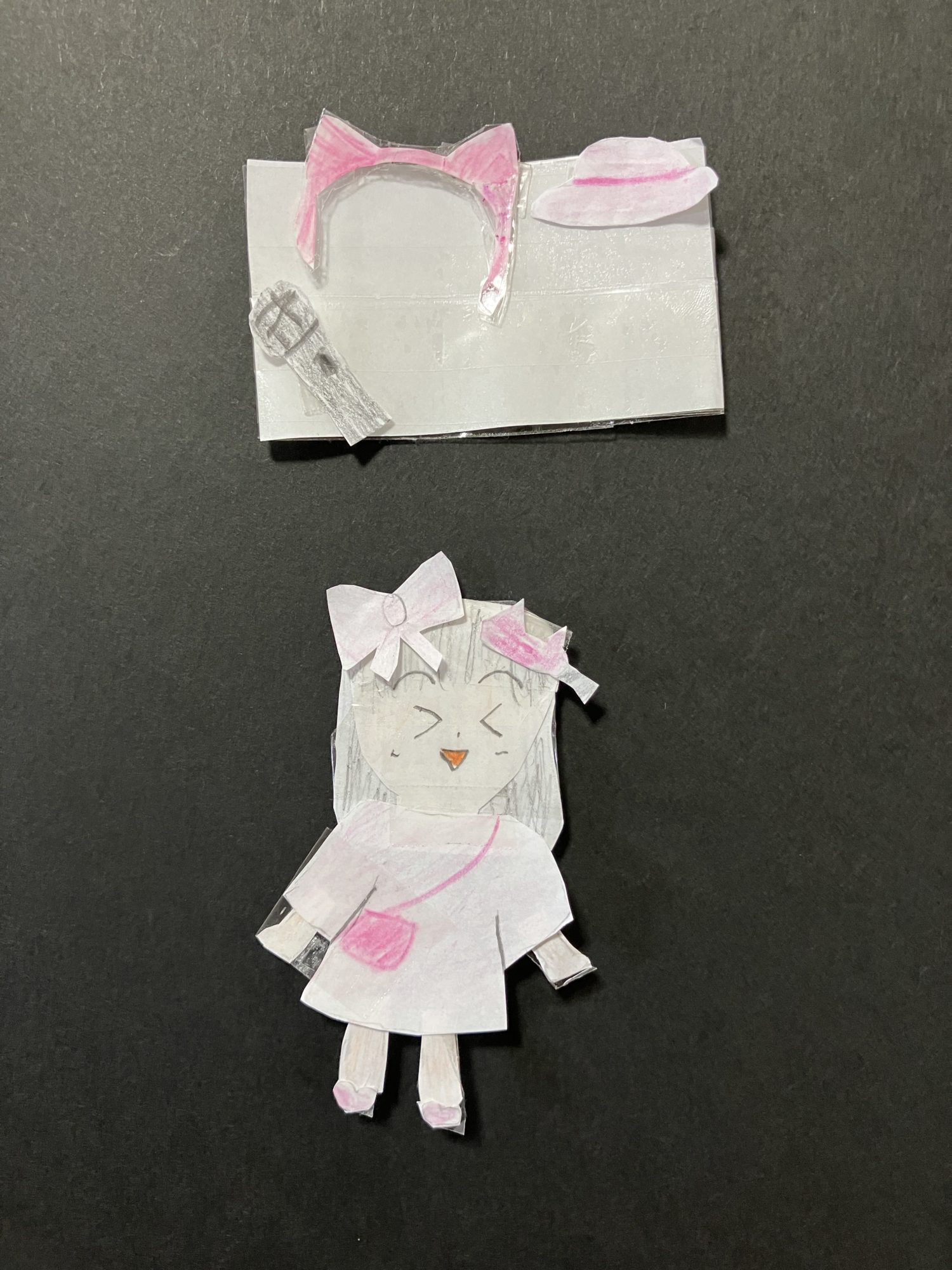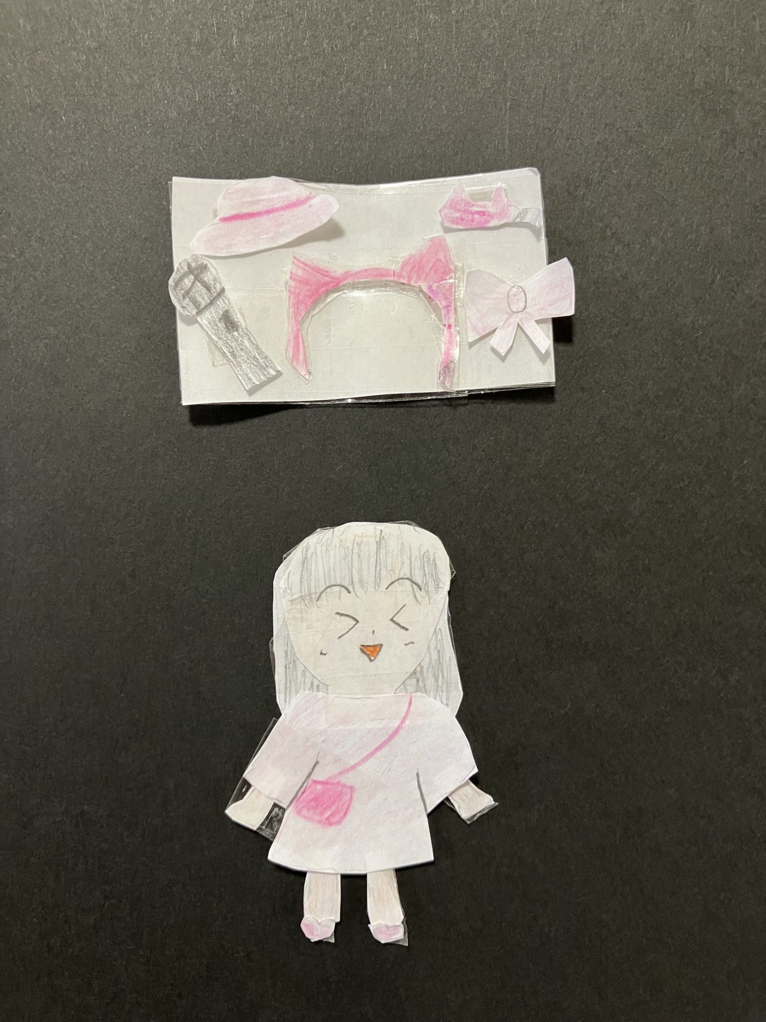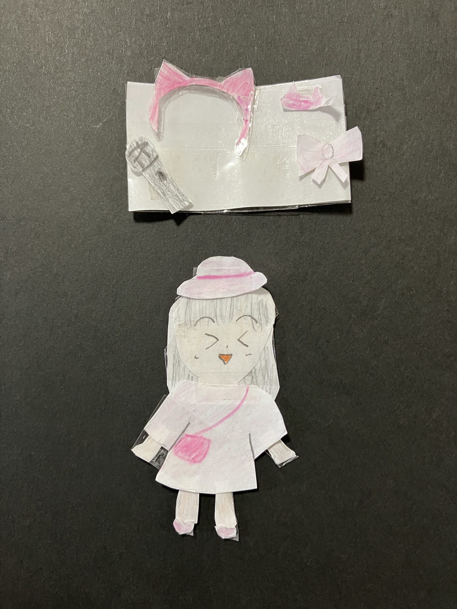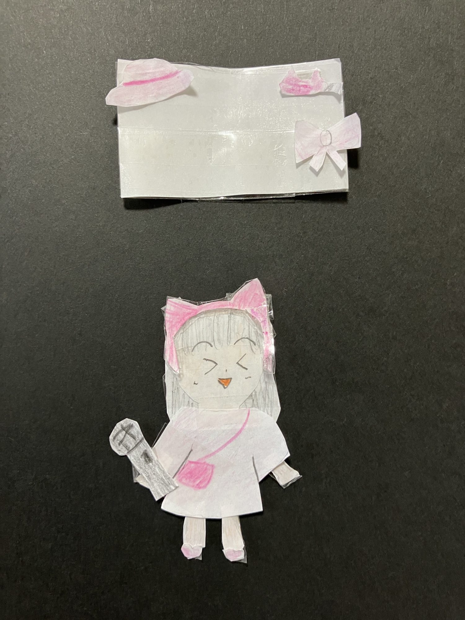 折り紙に色鉛筆で、かわいい女の子と、ネコのヘアピン、リボン、帽子、猫耳のカチューシャ、マイクを描いて切り、セロハンテープでコーティングしました。女の子の頭や手の部分にもセロハンテープでコーティングして、帽子などのパーツを貼ったりはがしたりできるようにしました。これからもっとパーツを増やして遊んでみたいです。