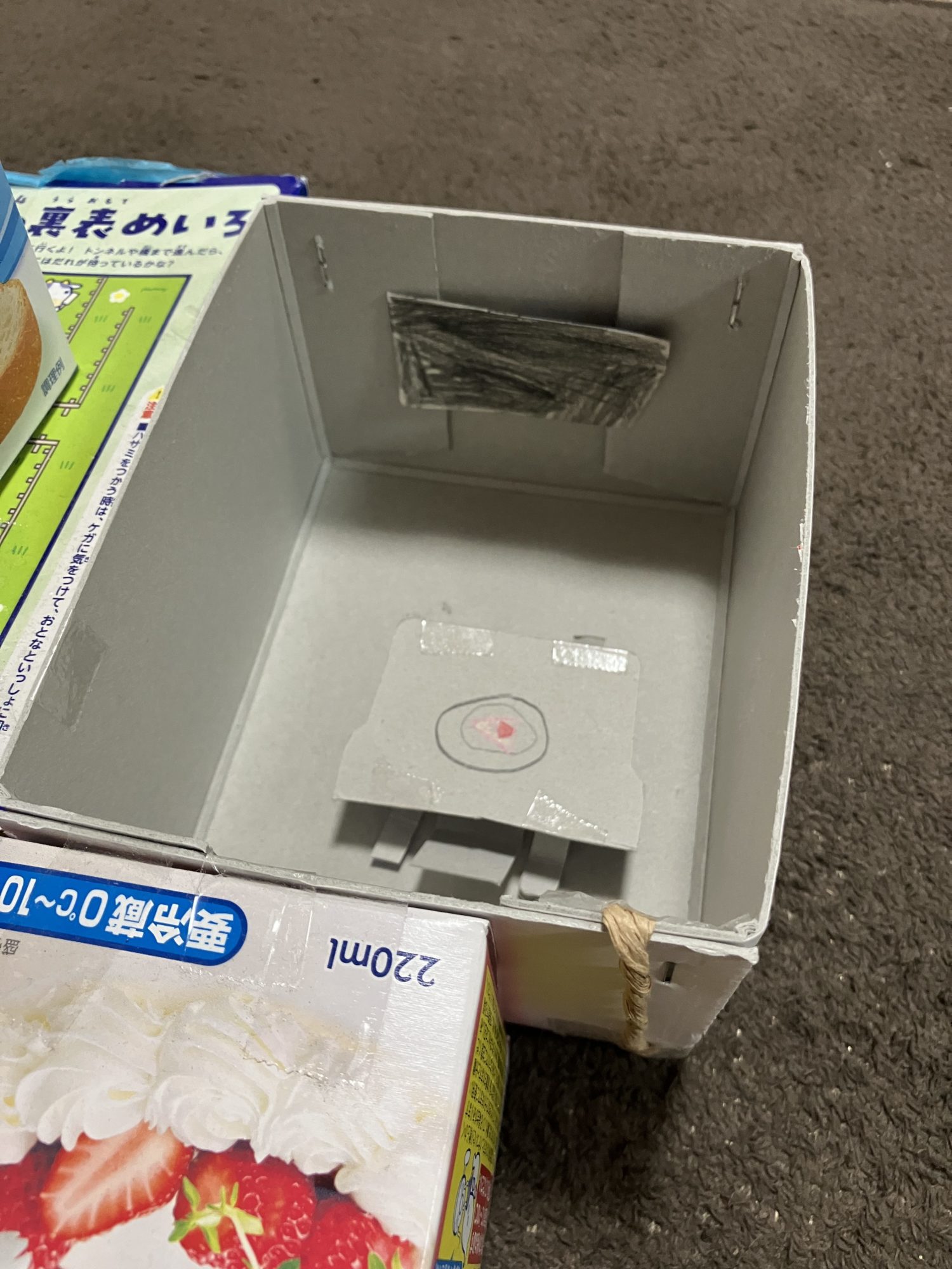 学校の図工の授業で、廃材を使って『ともだちハウス』を作りました。ブランコ、すべり台、シーソー、プール、トランポリンなどを作って、たくさんあそべる家にしました。トイレやお風呂場、リビングもあり、ロープをつけて部屋の外に脱出できるようにしてあります。