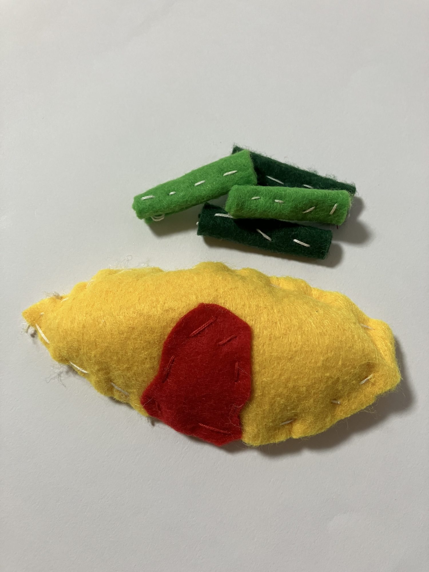 わかめせんせい 先生2025年10月8日 3:08 PM asahi さん とってもおいしそうなフェルトのオムレツとほうれんそうですね🥄✨ ふんわりした黄色と、赤いケチャップの色の組み合わせが見ているだけで食欲をそそります。 ひと針ひと針ていねいに縫われた跡から、「初めてだけどがんばった!」という気持ちが伝わってきます。 布のやわらかさを生かして、形にも温かみがあってすてきです。 次はどんな“手づくり料理”をつくってみたいですか? ログインして返信する ↓
