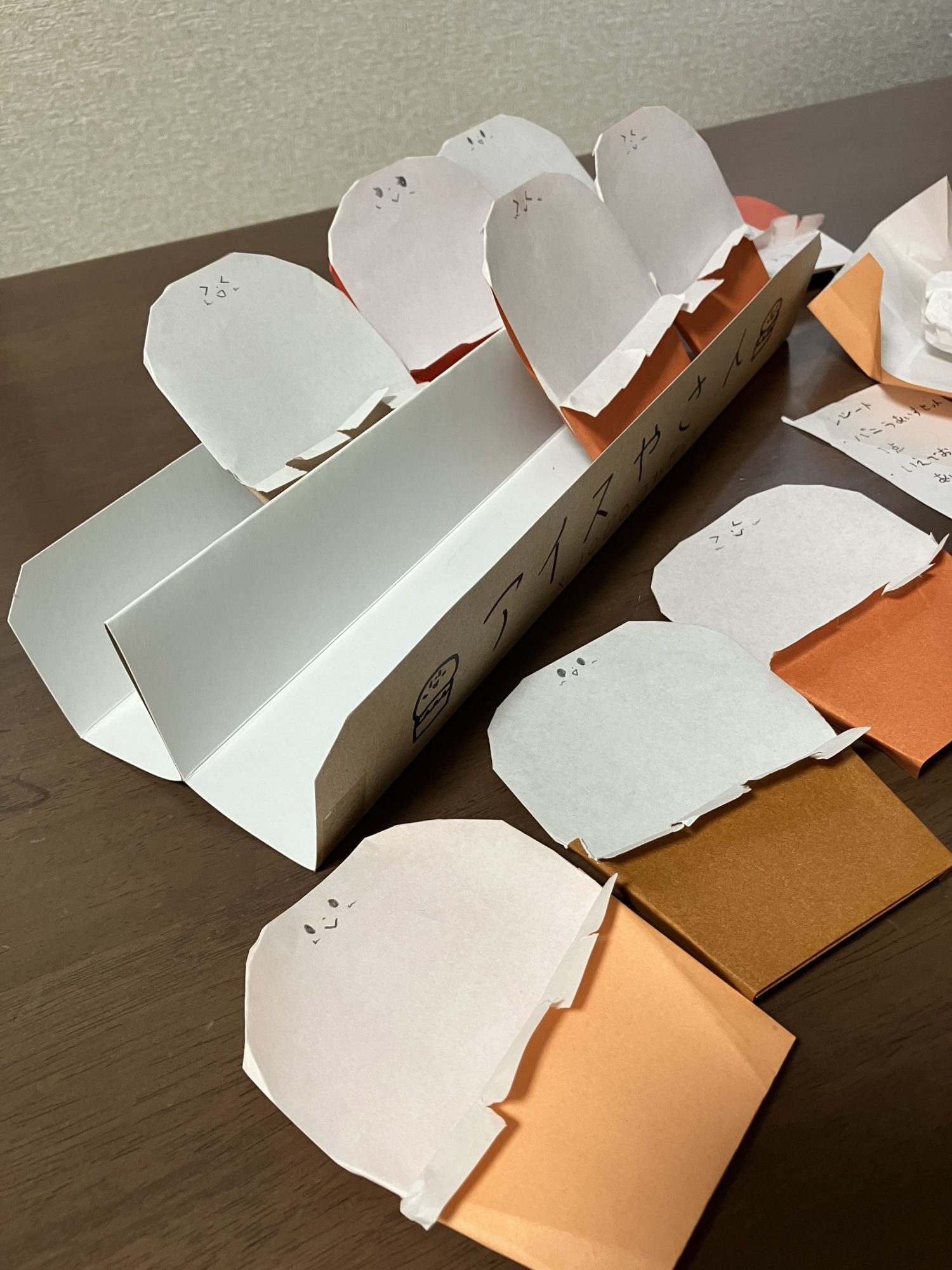 空き箱に入っていた「仕切り」のような物を使って、アイスやさんを作りました。折り紙でかわいいカップアイス(高級!)をたくさん作って並べました。