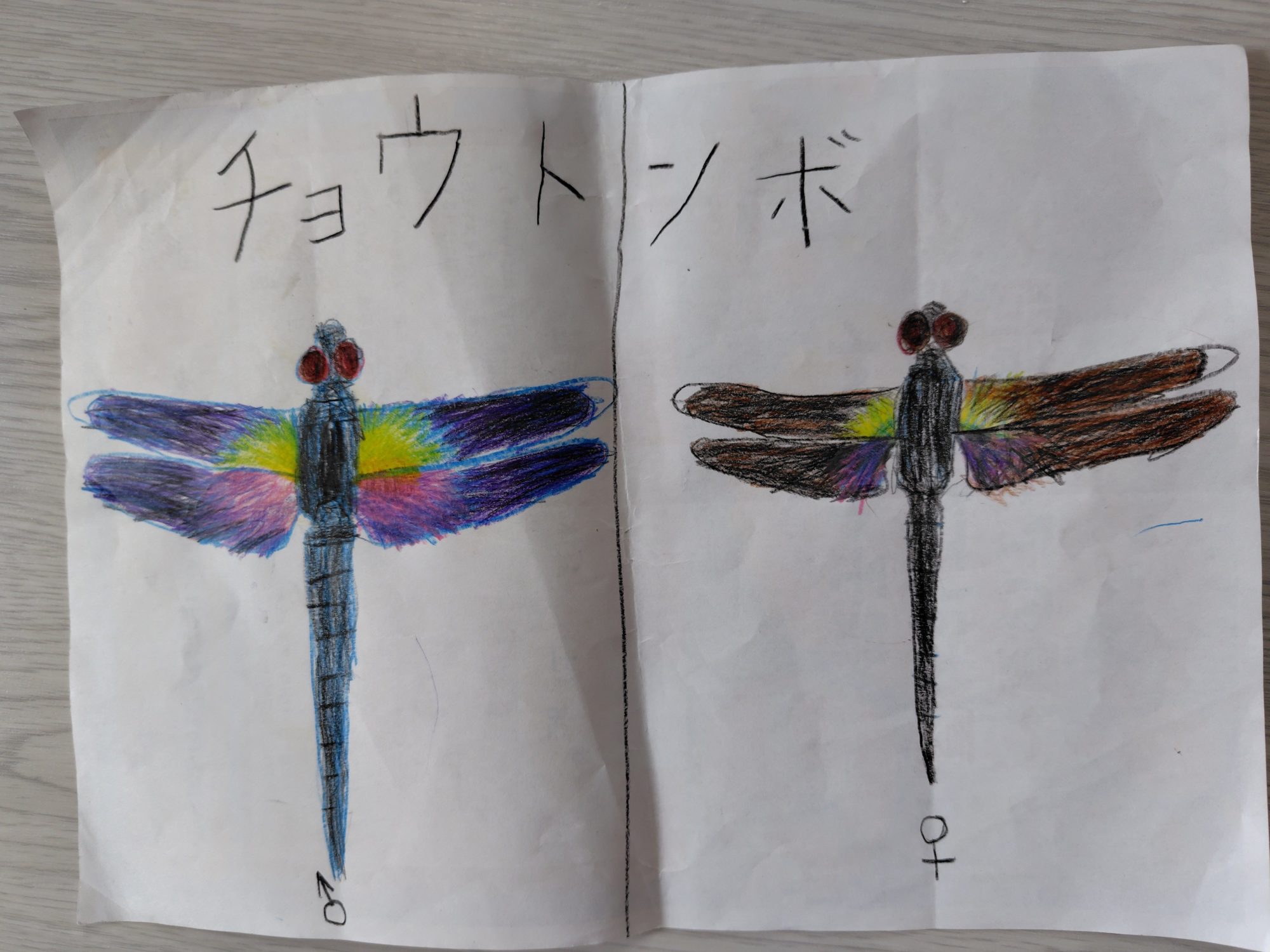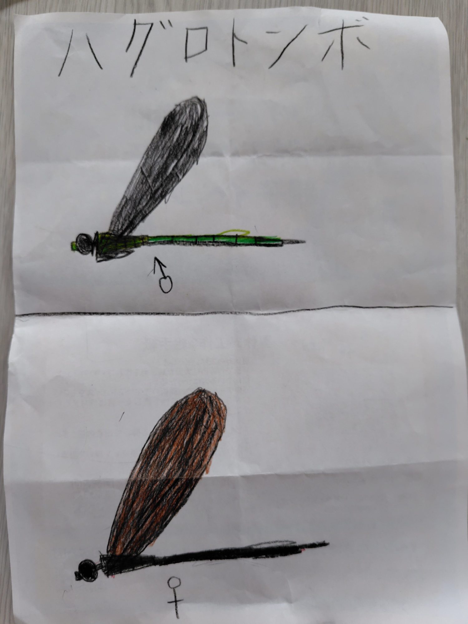チョウトンボの羽の青から紫、そして中心の黄緑へのグラデーションがとてもきれいで、まるで本物の光沢を感じるようです。オスとメスを左右に並べて比較しているのも研究的で、図鑑のような構成ですね。さらにハグロトンボの絵では、オスのメタリックな緑の胴体と、メスの落ち着いた茶色の羽の違いまで正確に描かれていて感心します。