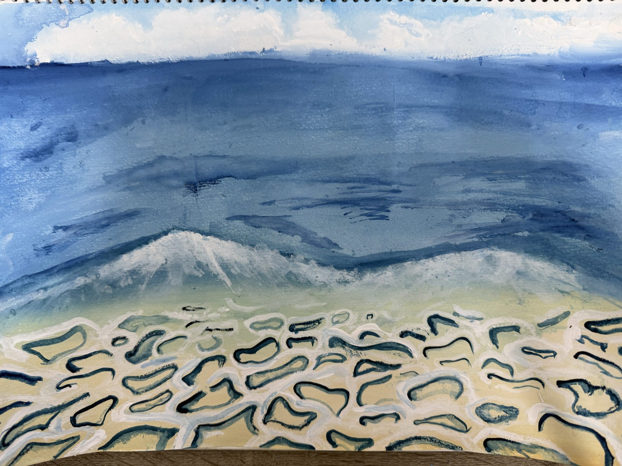 授業で描いたものです。浜にかかる水のところに遠近法を使ってみました。頑張りました。遠目で見たら意外といい感じに見えます。