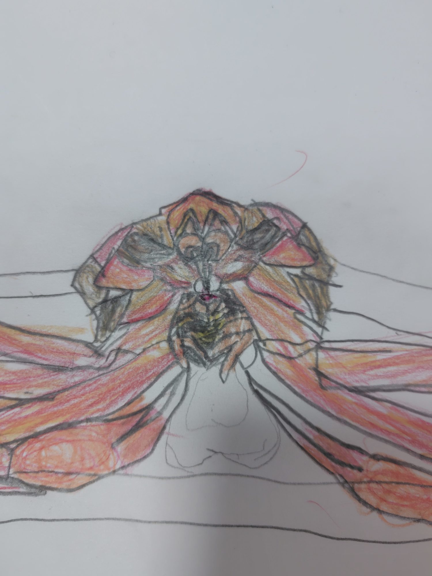 脚の一本一本がまるで生きているように躍動感があり、色の重ね方で殻の硬さや光の反射までしっかり表現されていますね。中央の甲羅部分は細部まで観察されていて、「観る力」と「描く力」の両方が高いレベルで結びついています。