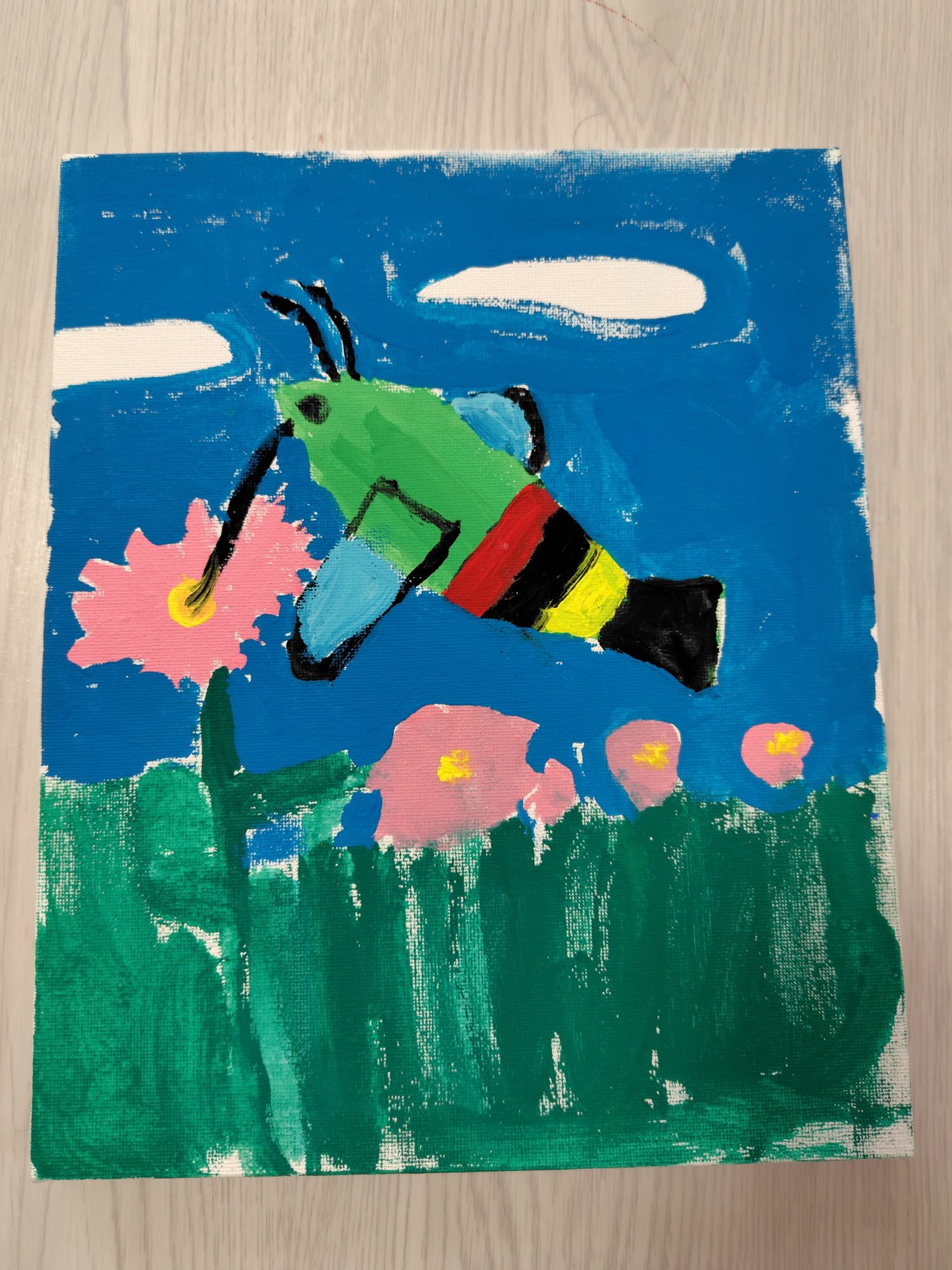 スズメガの絵も、色の組み合わせが鮮やかでとても印象的です。グリーンとブルーの補色関係がうまく効いていて、花とのバランスも心地よいです。