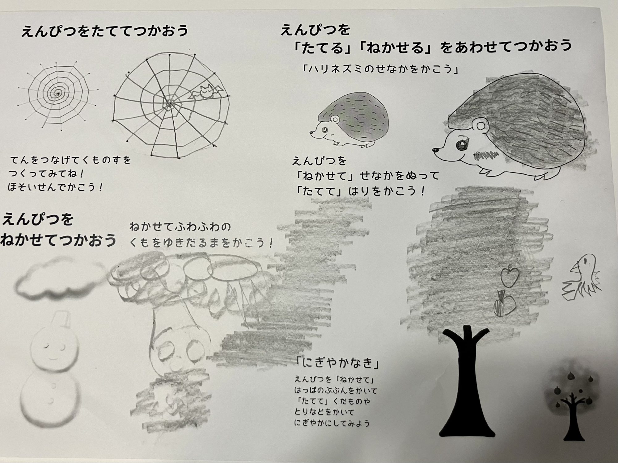 また、ハリネズミや木の絵でも、鉛筆を「立てて」「寝かせて」使い分けることで、毛の質感や葉のかたまりを表現できていますね🍃