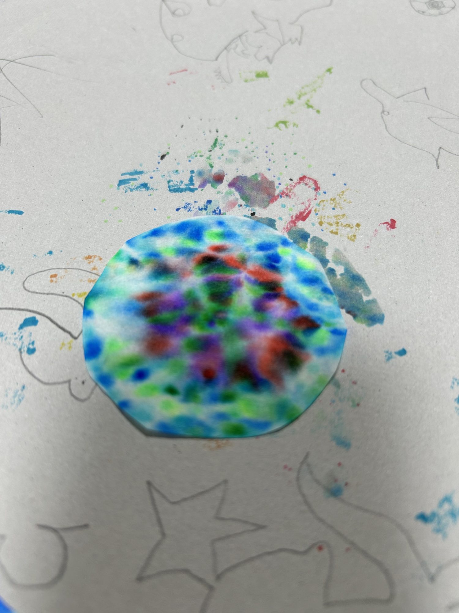 同じ色ペンの中に入っていた黄色とオレンジ色はなぜかにじまなくて、そのまま残るのがまたおもしろく、それを活かそうとしたら頭の中がこんがらかったようで、それもまた楽しく、とてもきれいでした✨